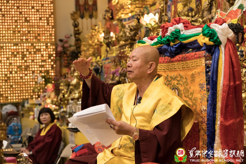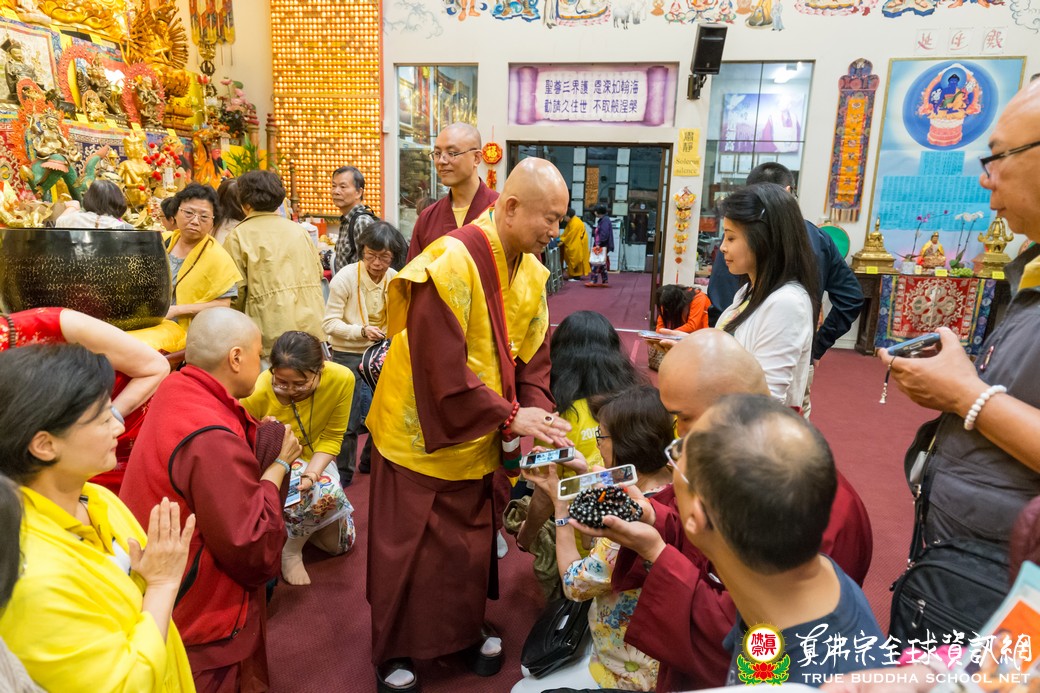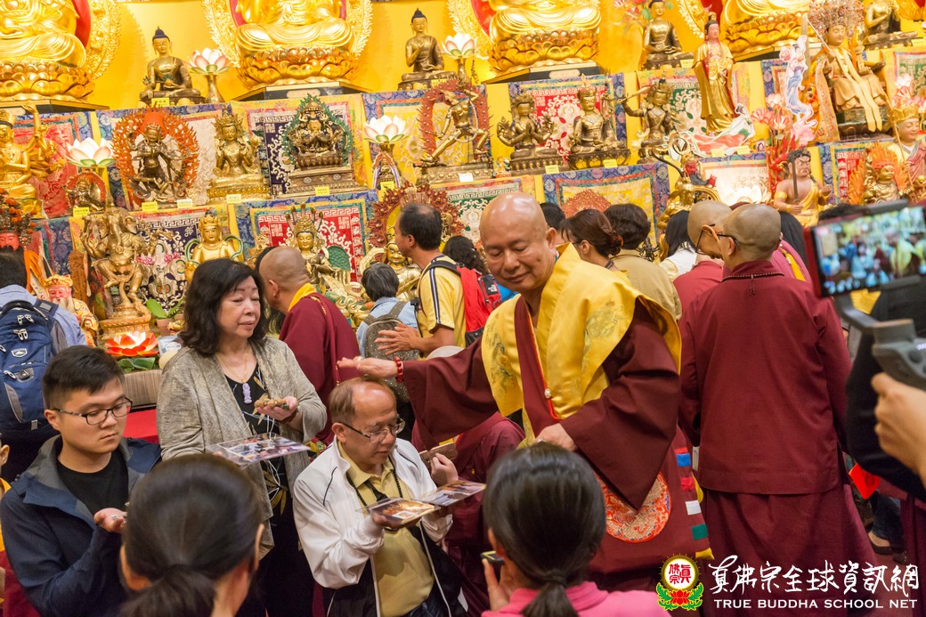 精采的開示結束後,聖尊為信眾賜授皈依灌頂、加持大悲咒水及開光佛像。離開廟前,聖尊慈悲的為大眾摩頂加持,讓大家所求皆能圓滿。看著聖尊步出大殿的慈悲身影,弟子們道不盡的感恩之情,內心深處衷心祈願著,我們慧命的父親蓮生聖尊健康自在、長久住世。