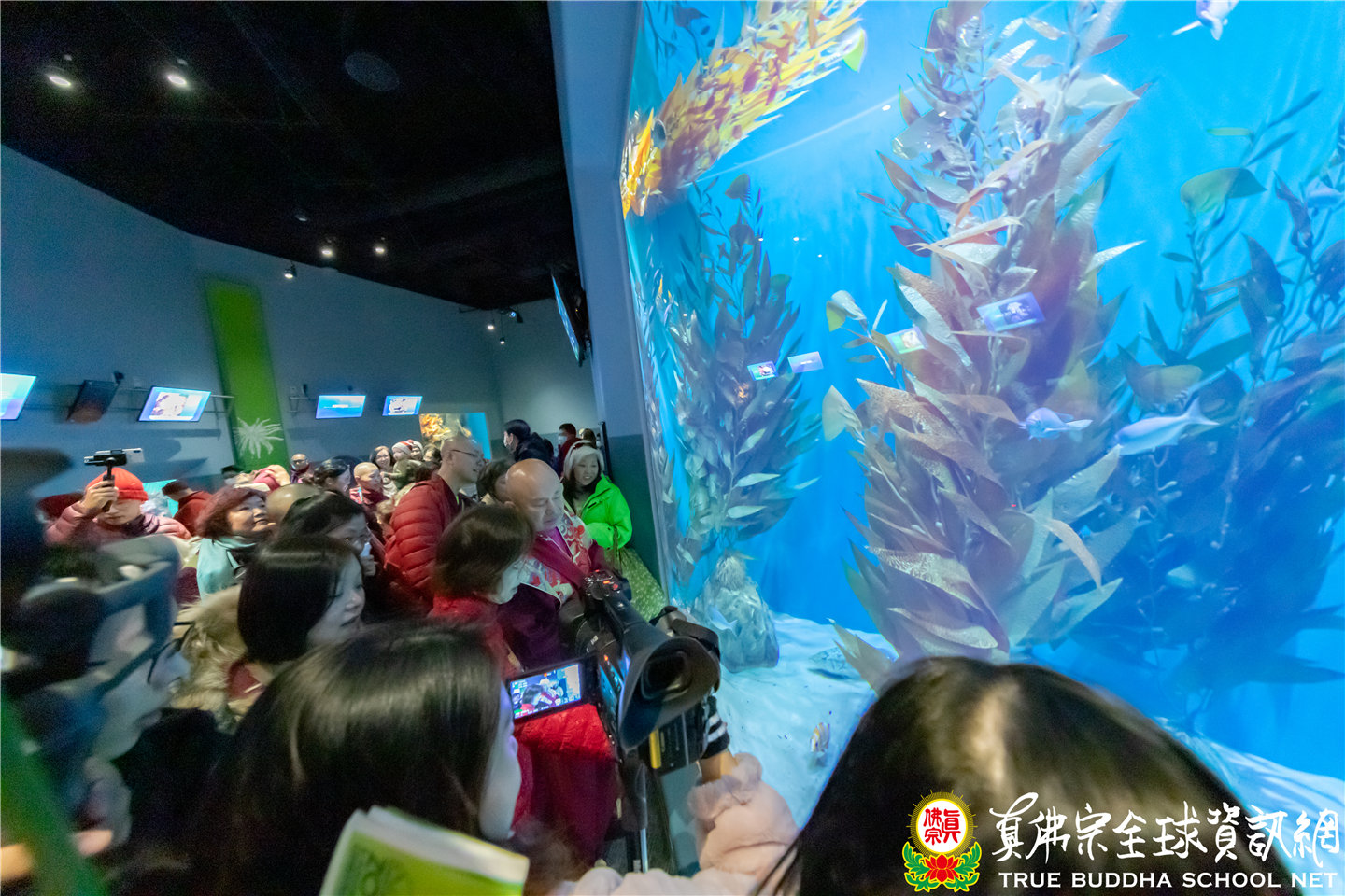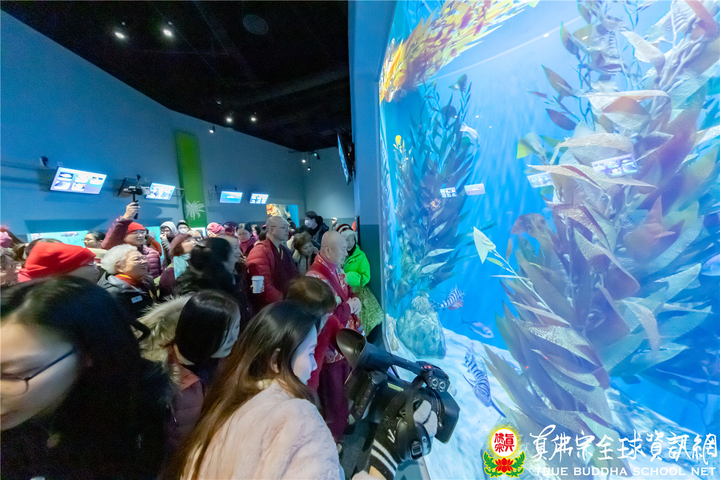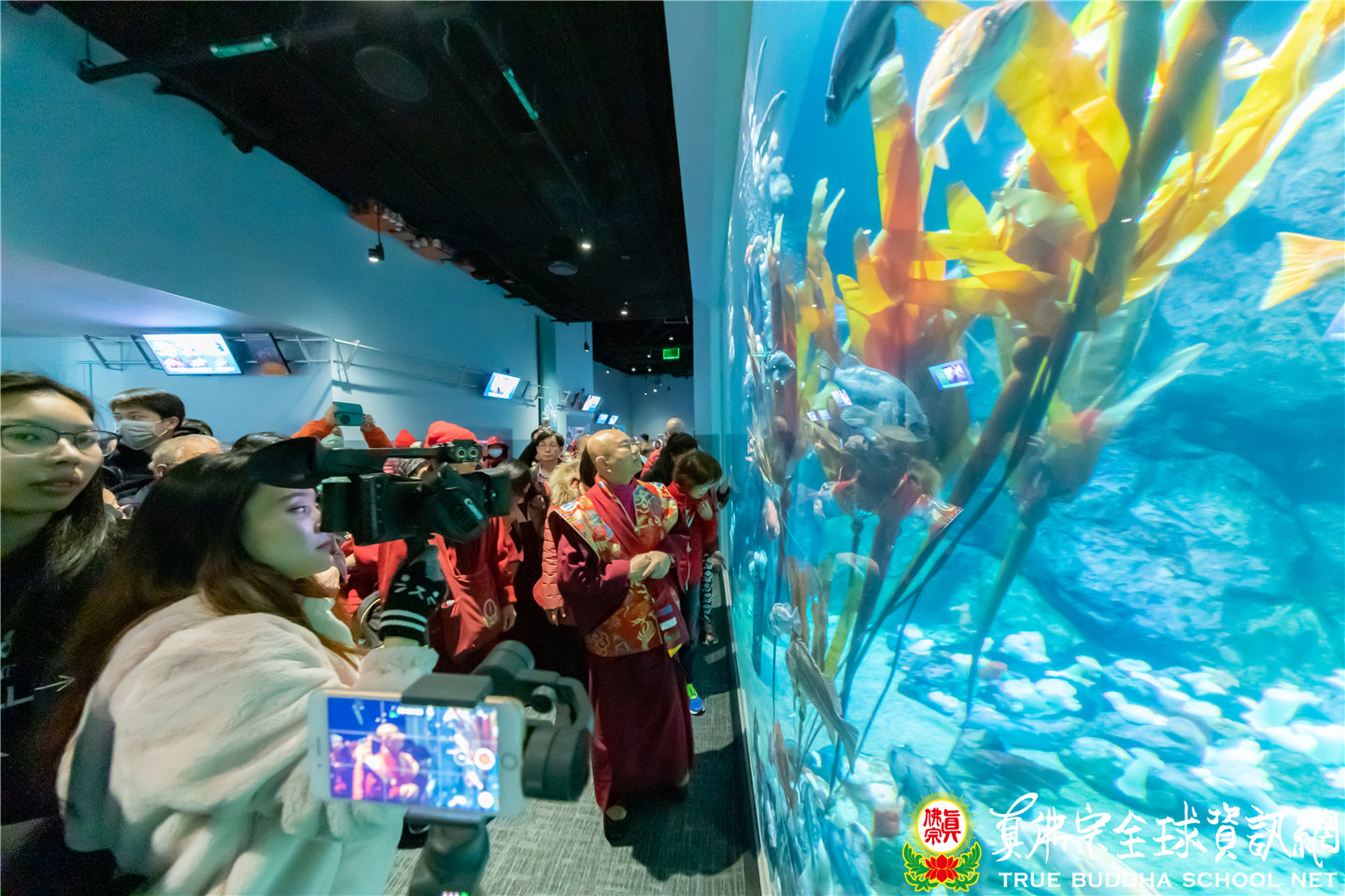 看動物的過程中,師尊的經典動物笑話也一再的出籠,例如爸爸最想看的動物是狐狸精;母老虎最可怕,所以安太座比安太歲重要;華人到動物園和水族館,有如在看海陸空菜單,問的是有無吃過該野味,好吃不好吃,特別是看到bison美洲野牛時,好幾位同門想到的是,哪個部位最好吃,真是中西文化大不同啊!走進了水族館,迎面而來的是鯊魚、魟魚、美妙的水母、海草植物等,有如置身在海龍王水晶宮,蟹將蝦兵來接迎。師尊也秀了一段英文演說,講題是’Why No King Crab in Alaska’ 盧氏英文讓大家完全聽懂,沒有隔閡,同門聽了皆齊聲叫好!來到海灘生物觸碰區,工作人員示意我們可以輕輕觸摸,師尊也用佛手輕碰了一下海星,給牠”摩頂加持”。