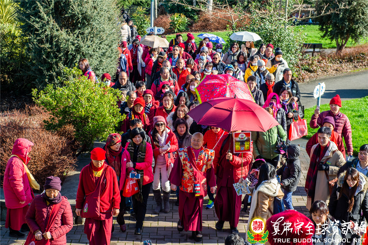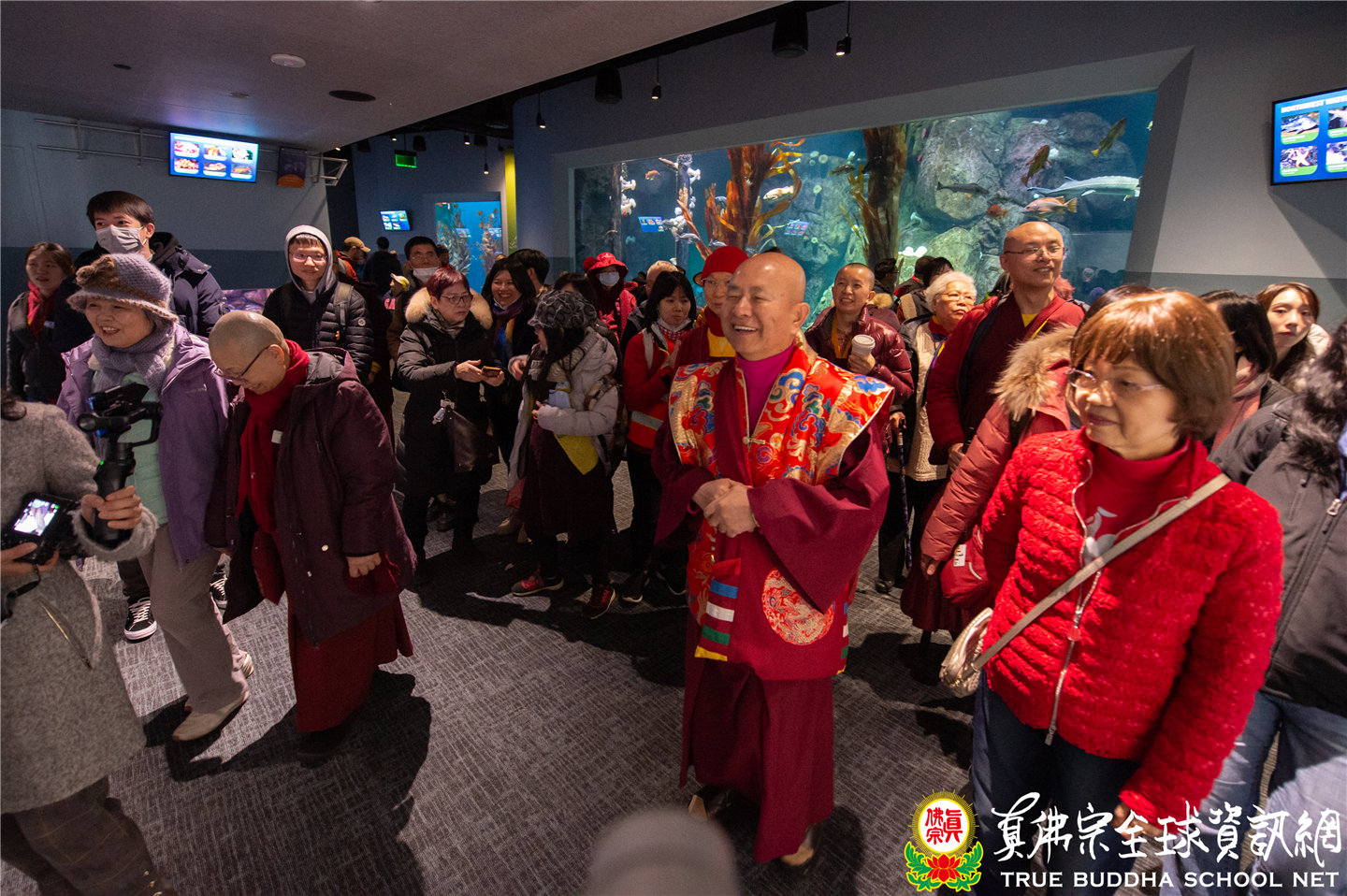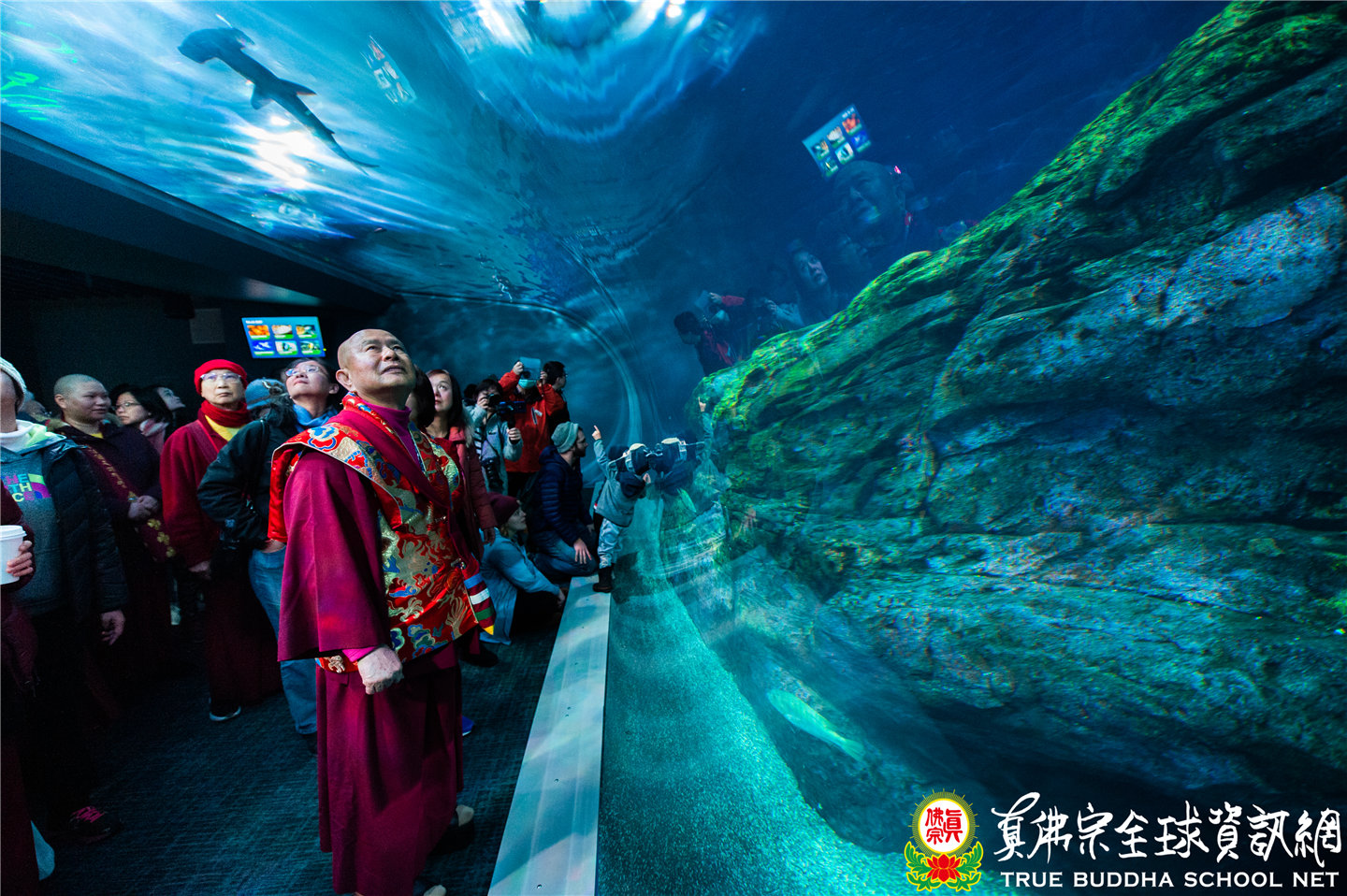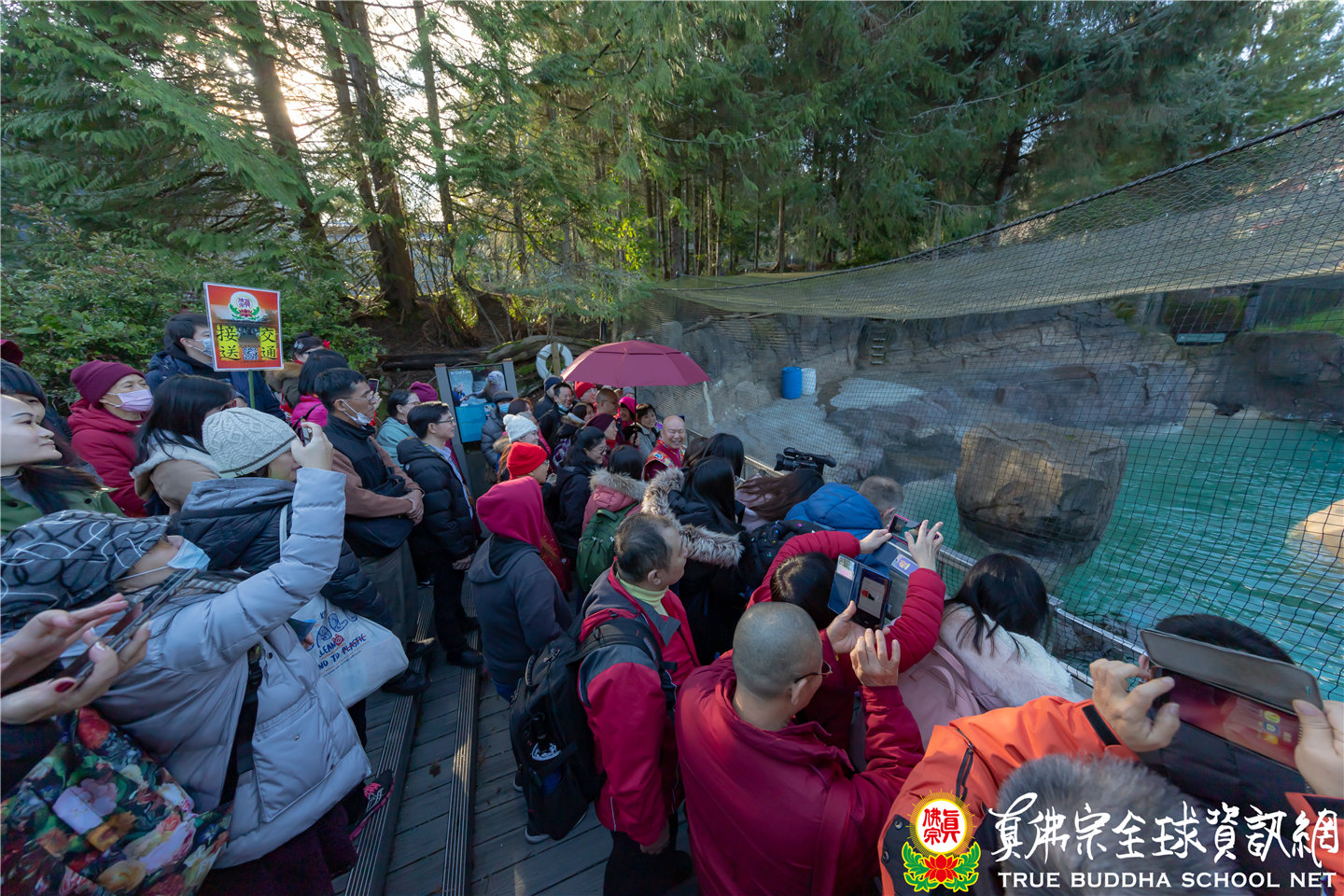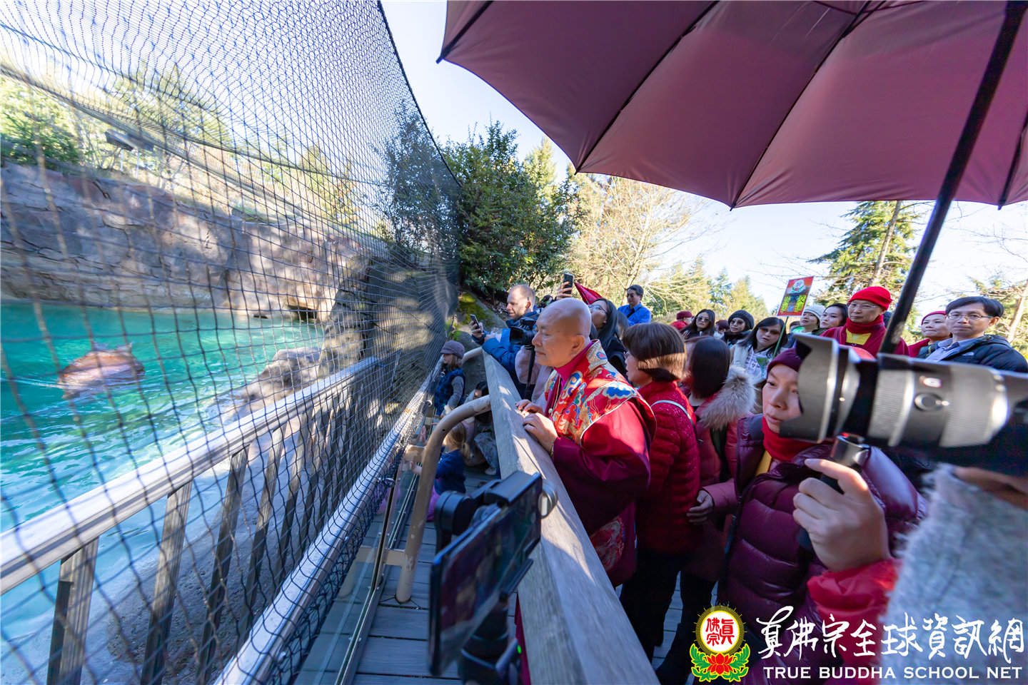 經歷多日下雨,空氣特別清晰、沁人肺腑,氣溫雖只有攝氏幾度,但在豔陽高照下,天氣是清爽宜人。此園區佔地29英畝, 展示數百種動物包括環太平洋地區和極地的動物和太平洋水域生物。在師尊師母的帶領下,眾人以雀躍的心情一一拿出入場票卷掃描進入園區。台灣來的豆豆師姐,負責擔任師尊師母的園區解說嚮導。Samantha師姐和兩位師兄則負責拍攝影片和照相,好讓師尊師母的精彩逗趣鏡頭全都被收錄。同門懷著踏春郊遊的心晴跟隨師尊師母,有人唱起兒歌,師尊與同門也跟著合唱:「走,走,走走走,我們小手拉小手,走,走,走走走,一同去郊遊...」師尊被眾人包圍,周遭有好幾組同門是三代同堂,老中青幼共遊,眾人言行流露著童心未泯,放眼過去,彷彿是眾多大中小蓮花童子眷屬圍繞的海會,真是熱鬧!