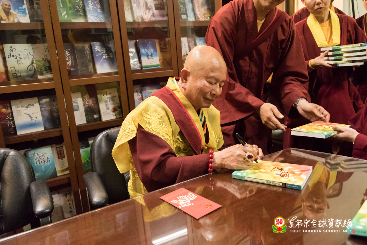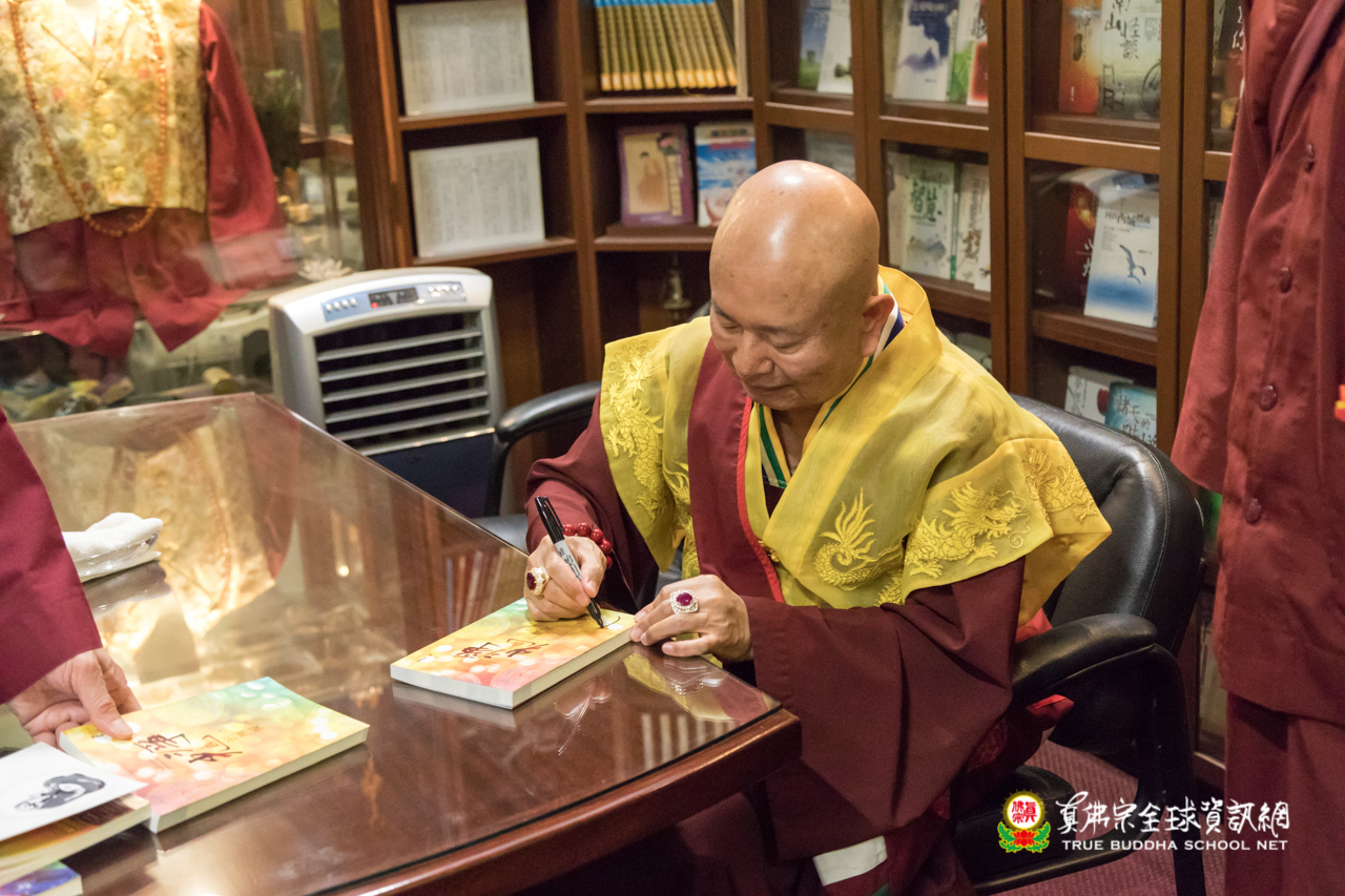 精采絕倫的開示後,聖尊為信眾賜授皈依灌頂、加持大悲咒水及開光佛像。會後,聖尊為大眾簽書,第二百七十二冊文集「淨光的撫摸」,人手一本新書,不但有根本上師的簽名加持,書中更有濃郁醇厚的法味滿滿。簽書結束後,聖尊慈悲的為大家摩頂加持。圓滿結束這充滿感恩的夜晚。