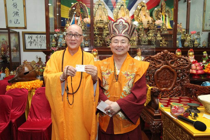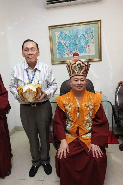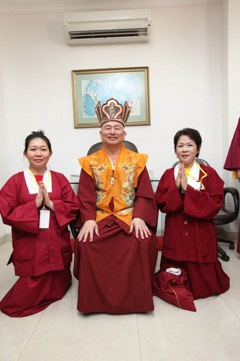 而來自大馬寶明同修會的蓮殷法師,供養恩師蓮生活佛法王冠及龍袍,活佛亦將自己戴多年的法王冠贈給印尼大燈,並親自簽名,由印尼大燈董事長蓮花耀全跪接,活佛說:「這是傳承信物!」。(請見下圖)