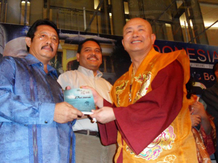 下午法王作家蓮生活佛等ㄧ行,蒞臨Sun Plaza書展簽書會場,國會議員巴霖弄安.蘇北省政治局穆哈默處長.印尼宗教部佛教司長Budi Setiawan .印尼蘇北佛教輔導司長Ketut Supardi .蘇北省長代表譚文南.蘇北省佛教團體黃印華主席…等貴賓蒞臨與會。