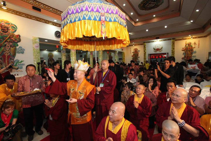 堂主蓮花家志伉儷虔誠向恩師蓮生活佛敬獻哈達。之後,蓮生活佛開示道:「三寶壟雷藏寺壇城法像莊嚴,佛法為何流傳在印尼,因為在印尼就保留著佛教的大壇城--婆羅浮圖,可謂是【印尼之寶】,證明佛教本身在印尼 早就紮下的根…。」