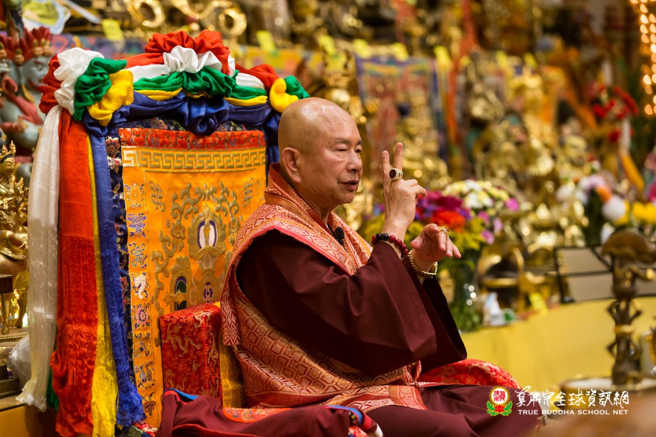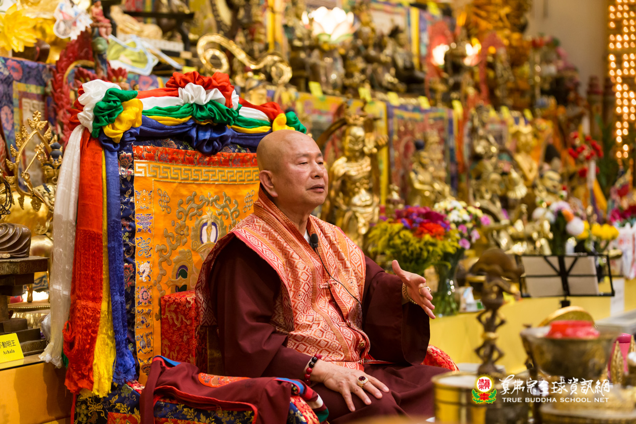 聖尊首先談到今晚的修法主尊蓮華生大士。祂說西藏密教的開始,是由蓮華生大士把密教帶到西藏,可以稱為藏地的第一位祖師爺。紅、黃、白、花四個教派,都非常恭敬蓮華生大士。祂與藏王赤松德真王、寂護大師,建立了西藏第一座寺廟桑耶寺。聖尊談到,蓮師手上所持的骷髏杖,上面有三個骷髏,正是代表著貪、嗔、癡,也就是佛教所說的三毒,這其中任何一種,都會讓人下到地獄的。為什麼蓮師所拿的卡杖嘎穿著三個骷髏?是表徵著祂已經把貪嗔癡全部都收掉了,沒有所謂的貪嗔癡。而世間沒有修行的人,沒有清淨的行為,一定會染上貪嗔癡的。聖尊認為一切的業大多來自於貪,除了真正的聖賢以外,都避不開權利、金錢跟色,這就是貪。嗔能夠變成戰爭,癡是包含所有一切的無明,而最大的愚痴就是認為人死了,什麼都沒有。因為佛教是講因果業報的。所以蓮師手上所拿的卡杖嘎,就是祂已經破除了貪嗔癡。在錢方面,聖尊談到自己一直謹守的一個戒律就是:盧師尊無論是弘法、皈依,絕對不會開口要錢。要當一個修行人,屬於自己的金錢可以擁有;不是屬於自己的金錢,就不能夠擁有。人是很愚痴的,我們追求人生的價值,追求清淨的生活,追求將來能往生佛國,甚至成為聖人,都要消除三毒貪嗔癡。
