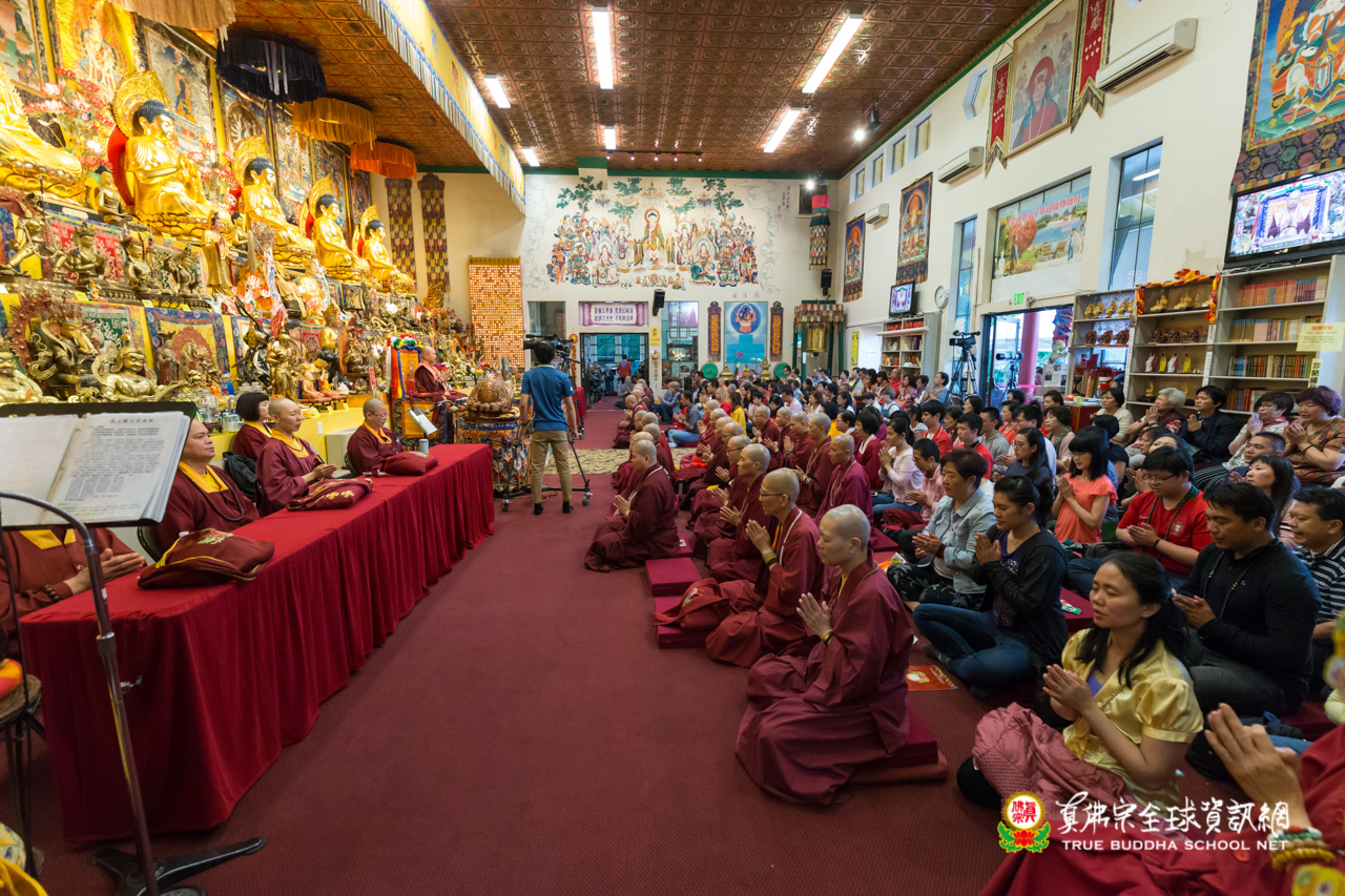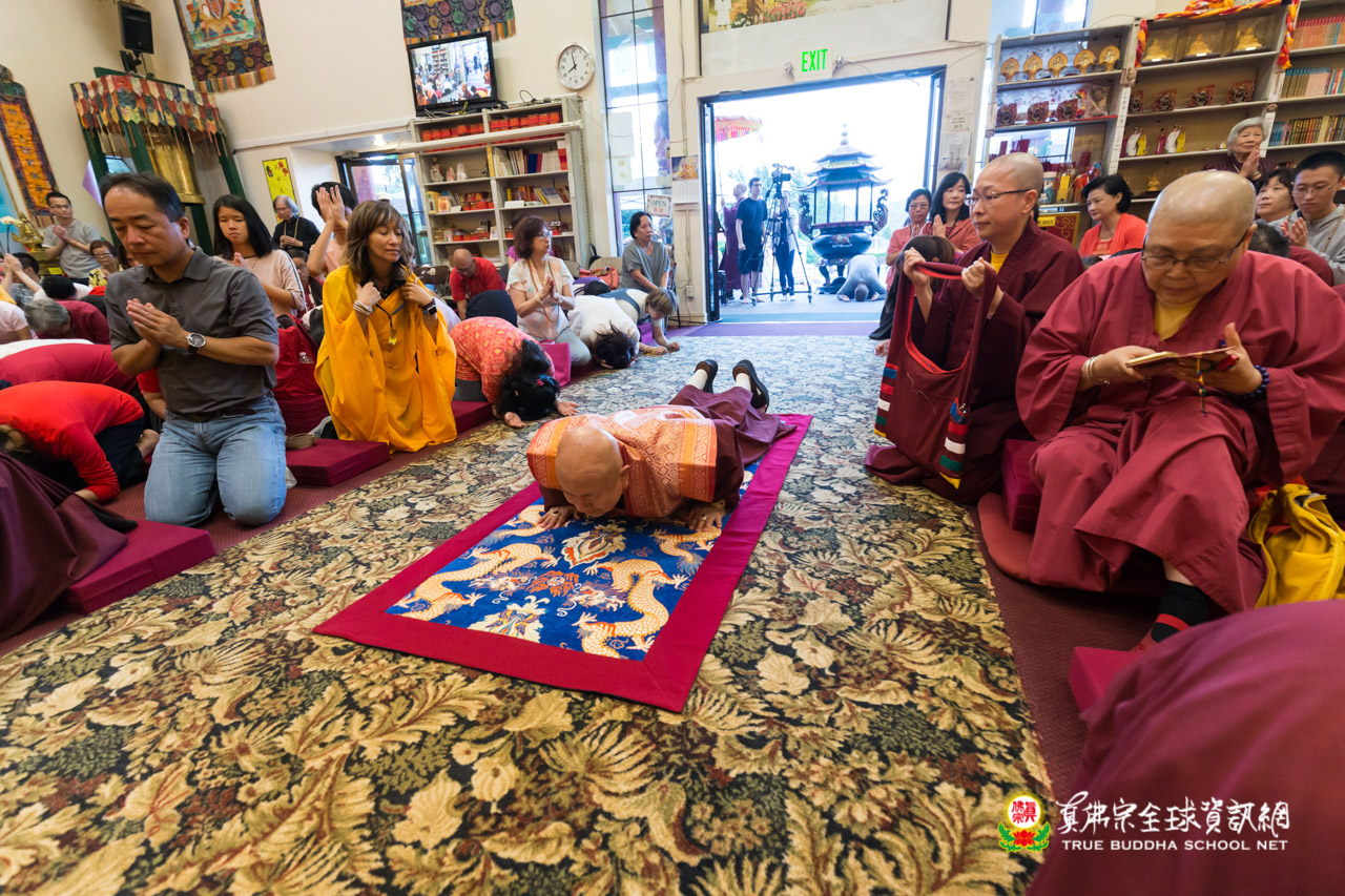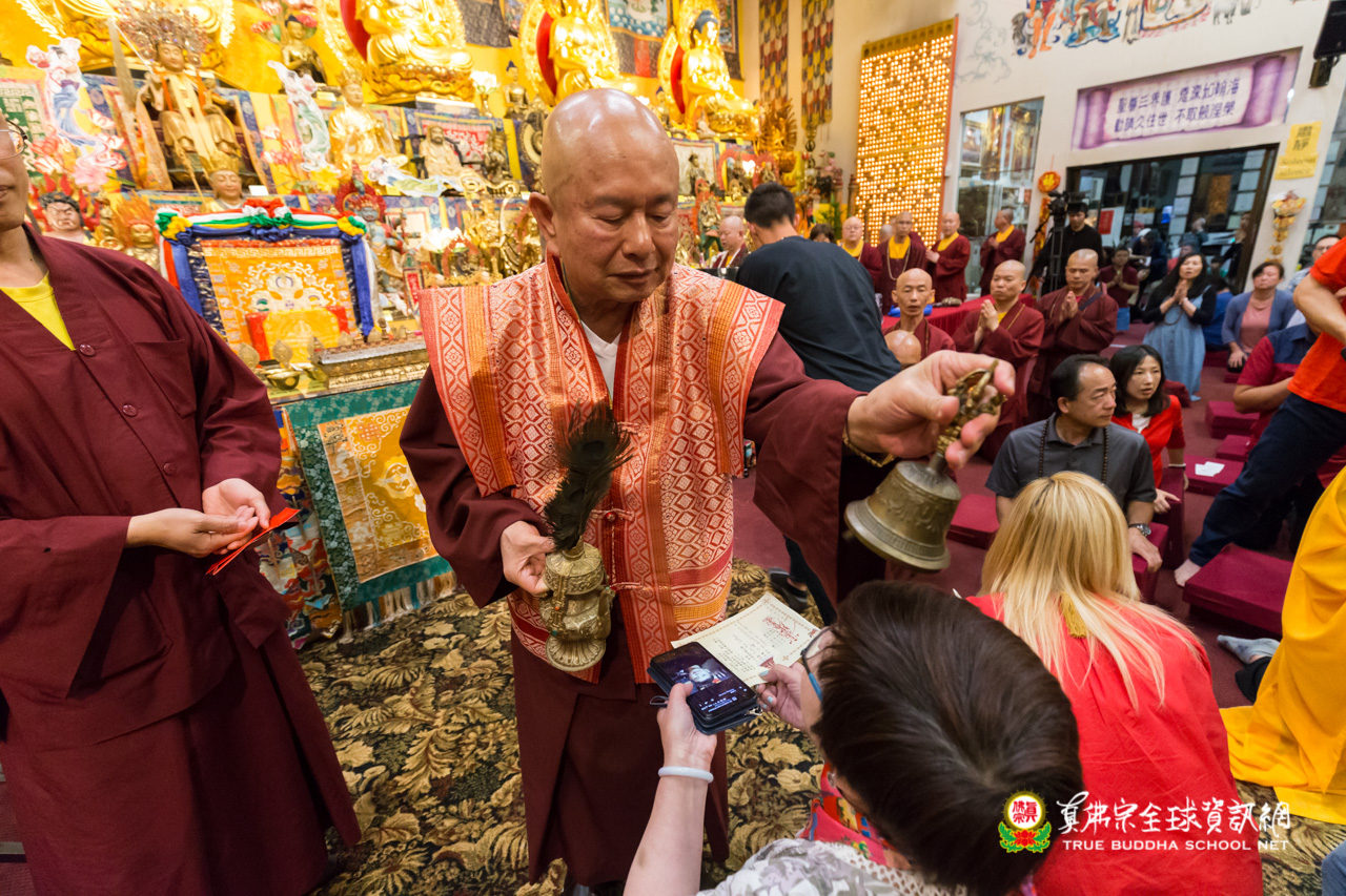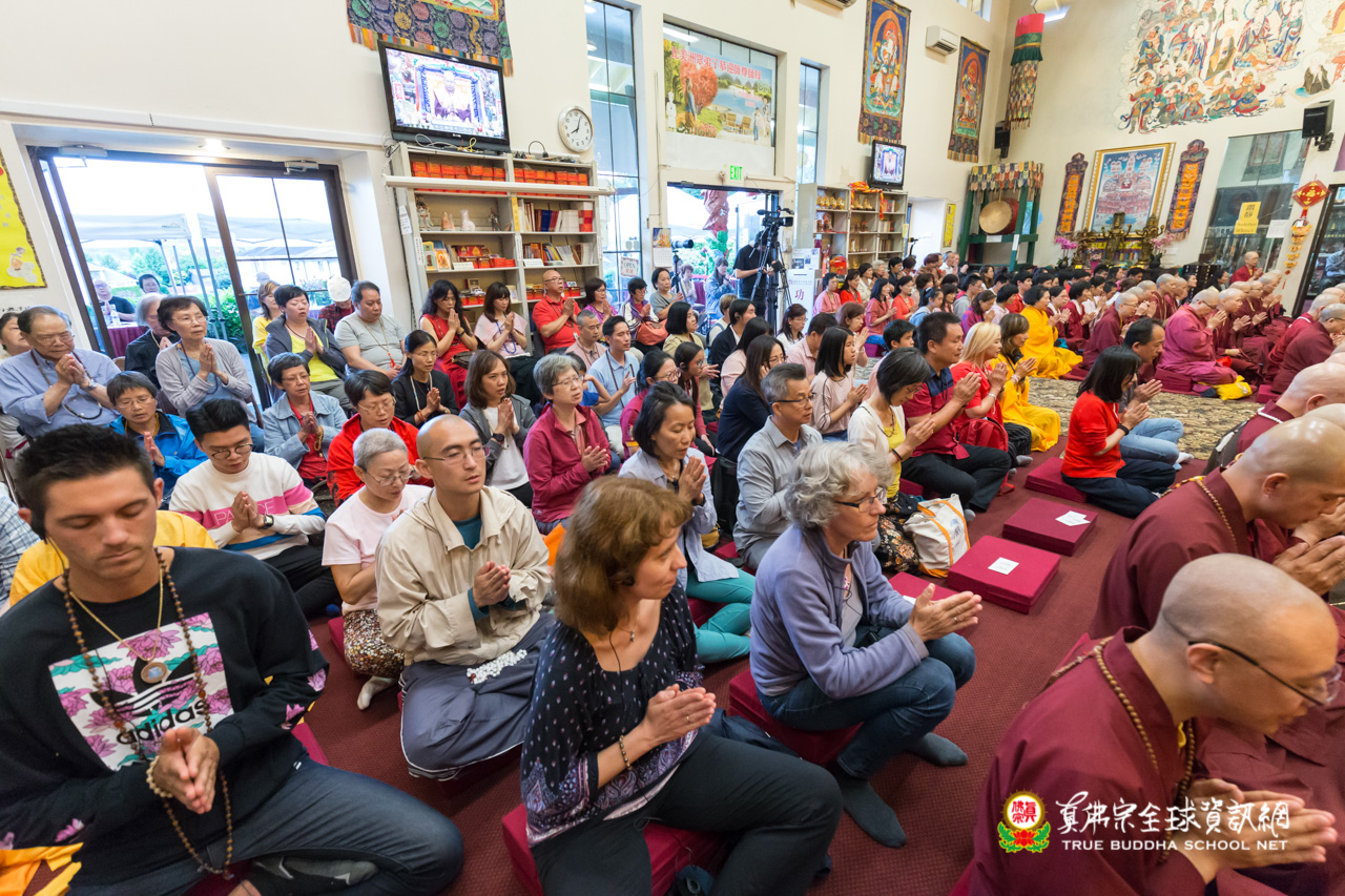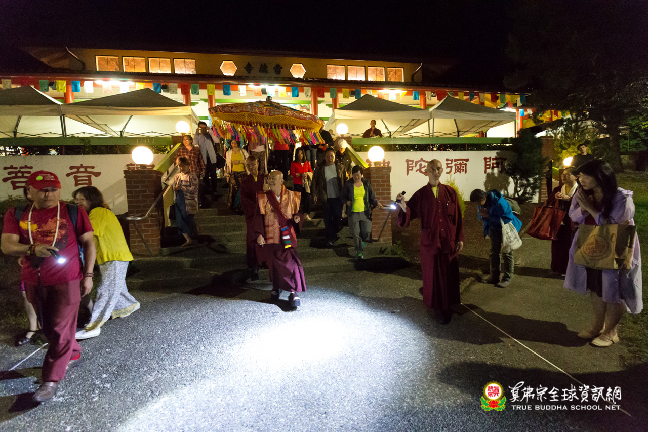 會後,聖尊為大眾賜授皈依灌頂、加持大悲咒水及開光佛像。離廟前,聖尊為與會善信一一摩頂加持。今晚聖尊的開示,身為弟子深刻感受到,對根本上師的恭敬和淨信俱足,是修行的首要根本,弟子們無論是白天黑夜,對於根本上師,都要能日間頂戴、夜裡住心。