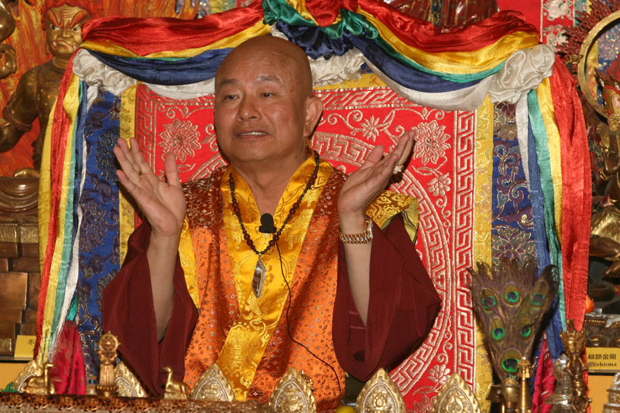 同修開示後,慈悲的聖尊為佛像開光、加持大悲咒水、為新皈依的同門賜授皈依灌頂,更為與會的弟子簽名新書:「大笑三聲」。聖尊離開大殿時,也一一摩頂加持迎跪的弟子們。