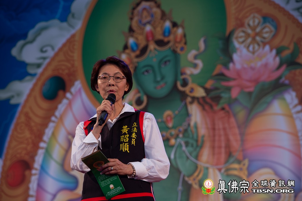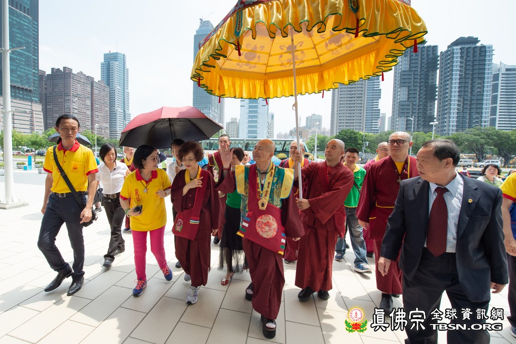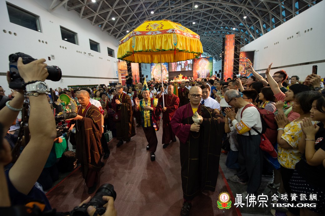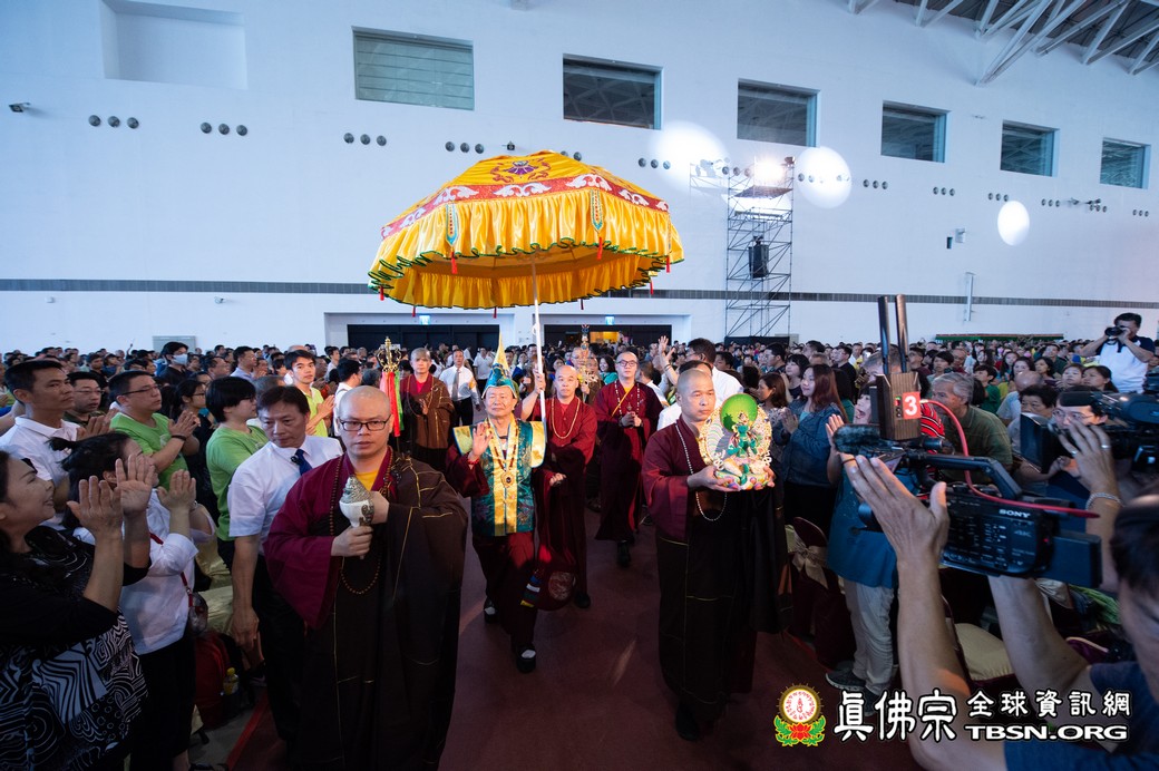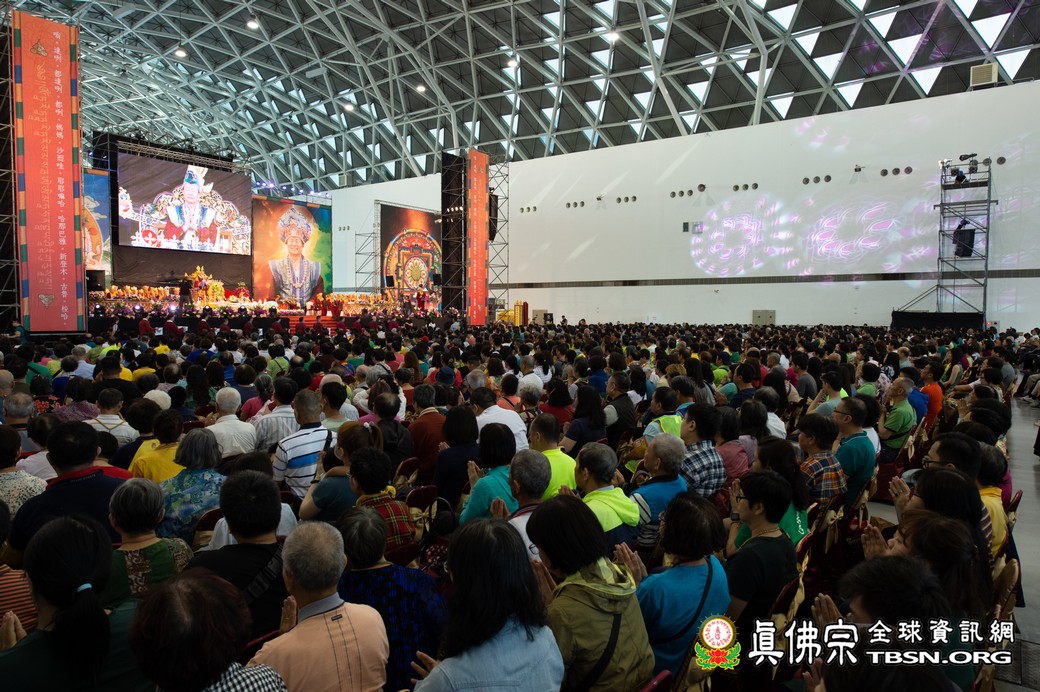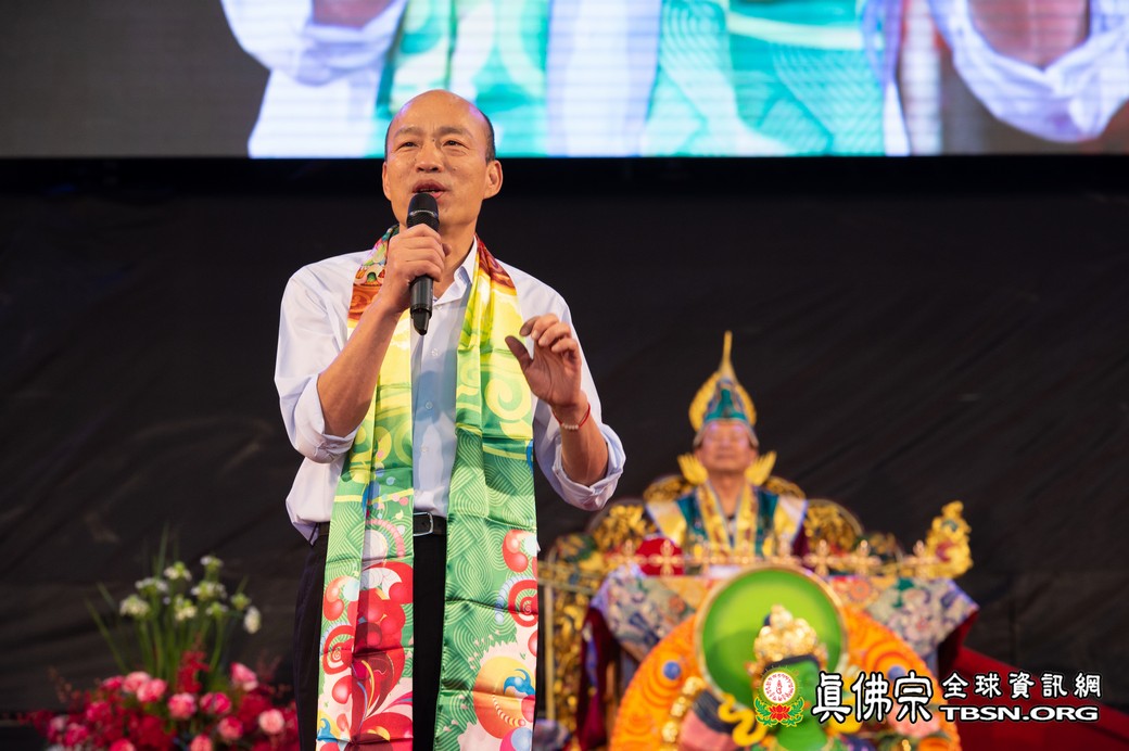下午兩點,迎師組與上師團恭迎根本上師蓮生法王高昇法王座,主壇「救天災度母傳法大法會」。現場逾萬名善信與各界名流齊聚,將高雄展覽館偌大的會場擠得水洩不通。法會開始前,多位貴賓上台致詞;高雄市長韓國瑜偕同幕僚蒞臨,韓市長並上台致詞,他從事政治活動,絕不能忽略黎民百姓所遇的艱難,要時時保持一顆謙虛的心,有感於「世間苦人多」,感恩師尊主持這場佛教盛會,讓世人無比浮動的心能寧靜下來,遠離顛倒夢想,讓台灣社會和高雄,更和諧及美好。「高雄小金剛」許智傑立委講到和師尊結緣五六年,學到了歡喜做和歡喜心,便能一輩子快樂幸福。黃昭順立委也感謝師佛的基金會協助全球災後重建,八八風災後,更在高雄建橋、協助弱勢兒童,並讚嘆這場盛大的「救天災度母護國祈福大法會」,能讓台灣、高雄遠離災厄,風調雨順、國泰民安。