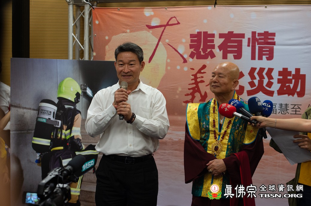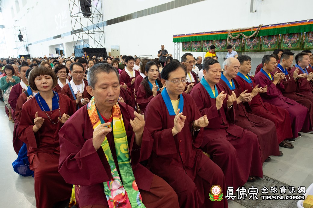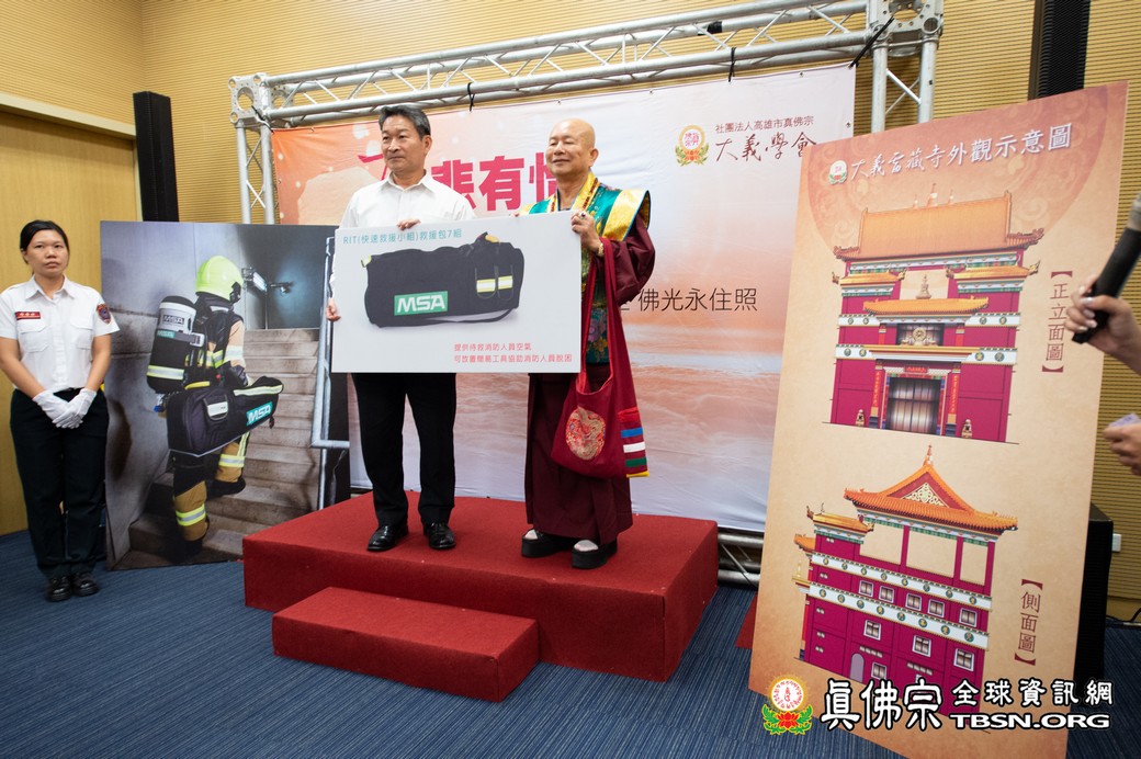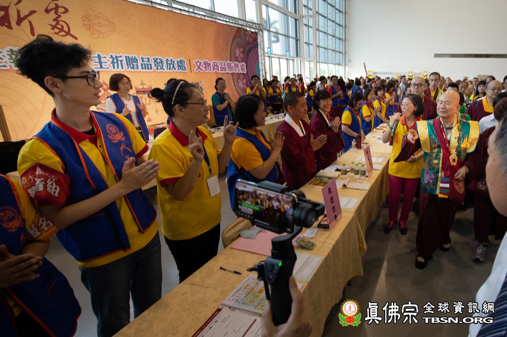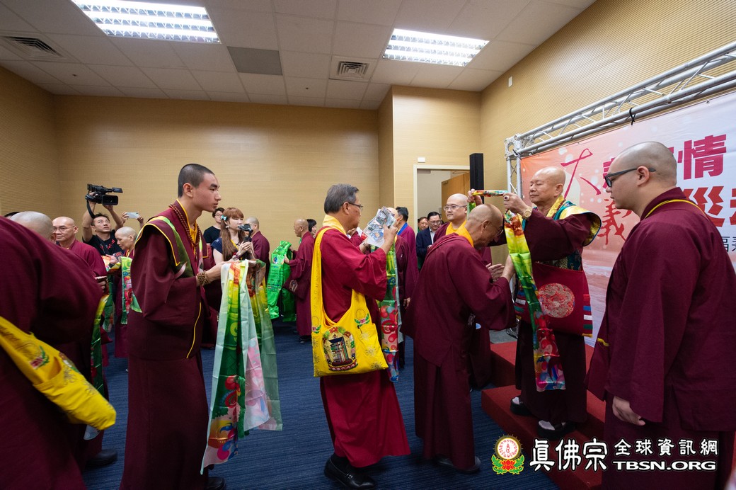 早在上午9點,四眾弟子便紛紛湧入會場。師尊、師母於10:50分抵達高雄展覽館,先加持了法會壇城、延生位、往生位及現場攤位,並持咒測試現場的音響設備;根本上師更自掏腰包,贊助了真佛般若藏和大義學會,如此實際的大賜福,令現場信眾無不感動。中午時分,功德主紛紛向師佛敬獻哈達,祈求救天災度母大悲心的加持,圓滿每一個善願。接著師尊接受了中天、民視等媒體的採訪;師佛講到自己與高雄的淵源,對此處有很深的眷戀,今日傳「救天災度母」法,就是要消除這片土地和台灣地、水、火、風的災難,真佛宗更熱心公益,「大義學會」為體恤打火兄弟的危險辛勞,特捐贈總價約台幣50萬的RIT(快速救援小組)救援包7組給高雄市政府消防局,黃江祥局長也回贈感謝狀,眾人皆期許「大義雷藏寺」速在高雄市矗立;記者們也問及現任高雄市長韓國瑜和蓮生法王的因緣,原來去年4月8日在高雄國際會議中心的「綠度母」傳法大法會,當時尚未成為市長候選人的國民黨高雄市黨部主委韓國瑜,就在法會上向蓮生活佛敬獻哈達,師尊感應到綠度母、二十一度母和咕嚕咕咧佛母給了他很大的加持,韓國瑜亦是相當努力與親民,能體恤百姓疾苦,自然俱足當選的善緣。
