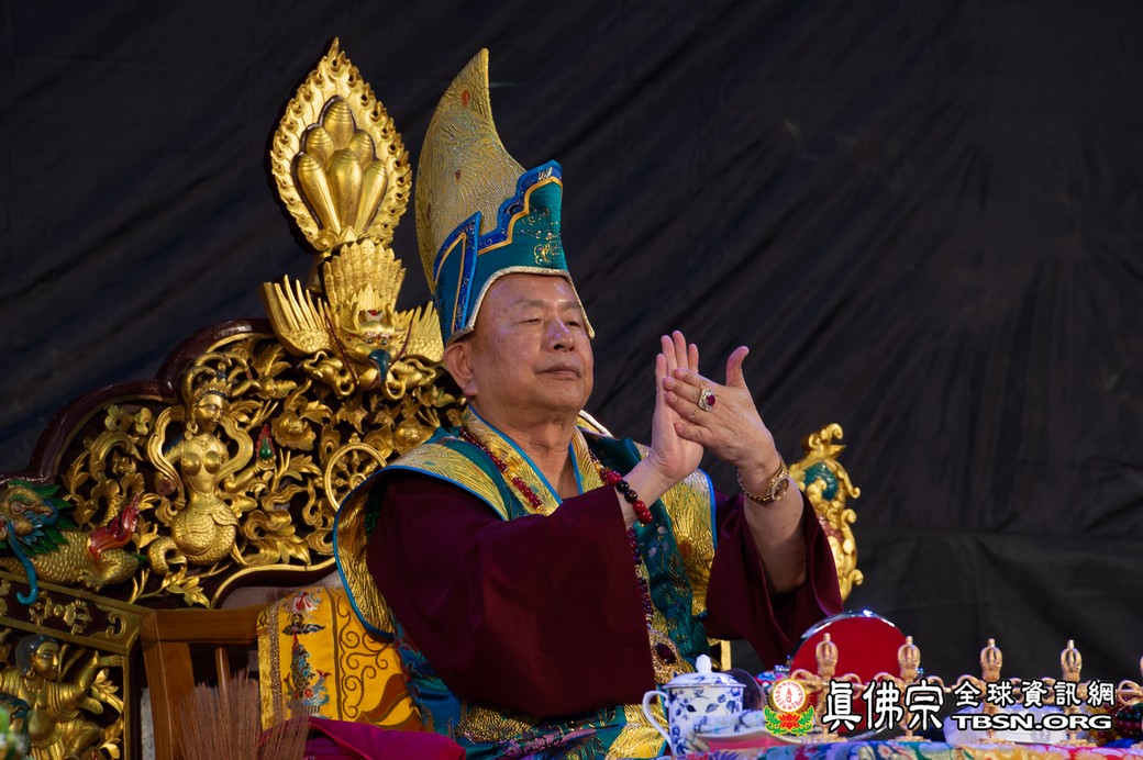 開示時,師尊感謝每一位來賓的蒞臨支持。今日救天災度母、綠度母、二十一度母、般若佛母及以下所有佛母、空行母悉皆下降,令本場法會靈氣充滿!「救天災度母」法有弭平世間地、水、火、風等天災的大威力,而救災各有口訣;想壓制一塊土地的地震,要在此處東、西、南、北四方和中央各取一公斤砂土,在壇城修「救天災度母法」108壇做加持,修完法將五方土各還於五方,取一公斤土,還一公斤土,如此該處將不再地震。而「兵來將擋,水來土掩」要救水災,可取河邊的土回壇城修法,後將土灑回,該河便不再氾濫。要救「火災」,則在房子著火時,行者修九字真言法,唸:「臨兵鬥者皆陣列在前」,結「四縱五橫印」壓向火勢,火就不再延燒,消防車也會很快趕至。至於「風災」,尊勝佛母塔、尊勝佛母咒和救天災度母咒,都能鎮颱風;在一塊土地建尊勝佛母塔,颱風即轉向。如颱風盛行的關島,一設立尊勝塔,颱風便不再登陸。上述法門極其珍貴,未受灌頂的上師、弘法人員和同門皆不可修!