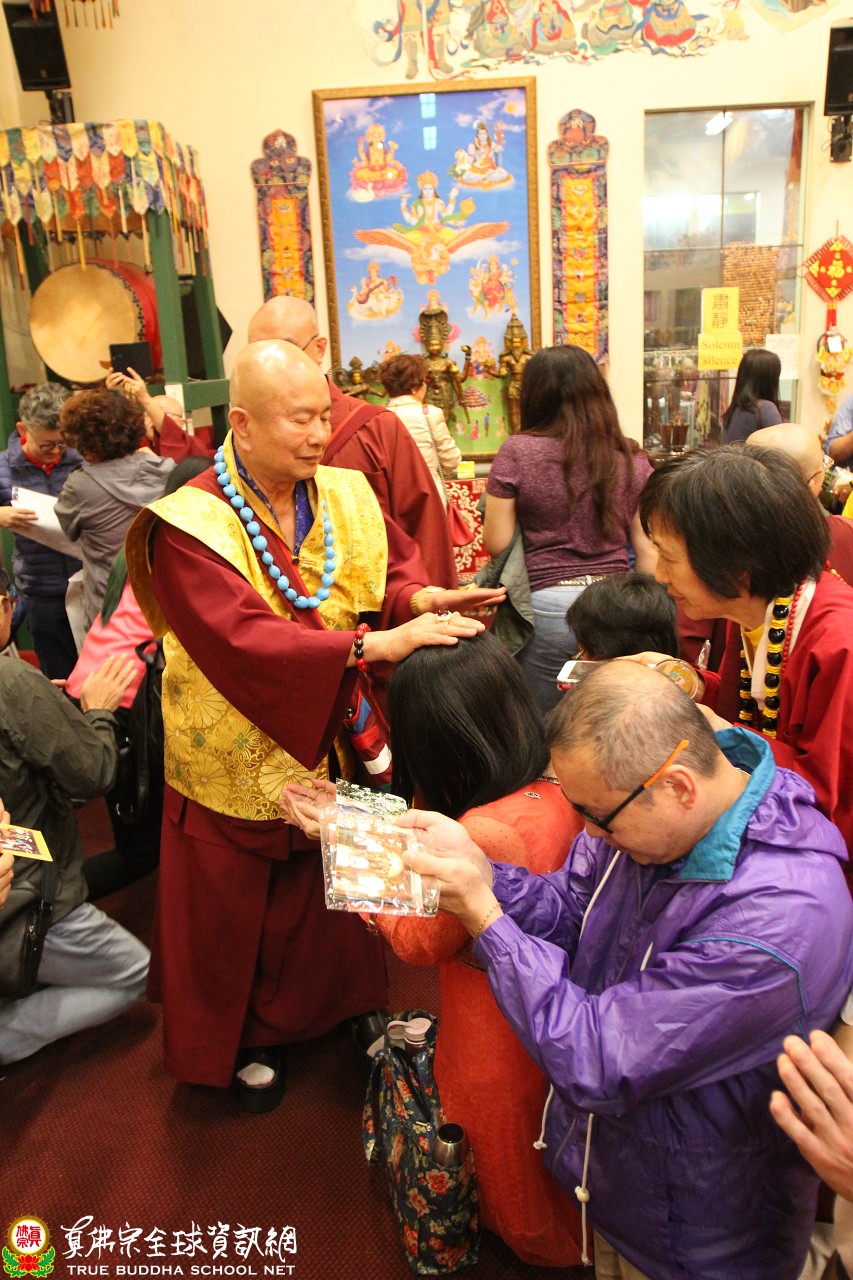 在師尊結束精彩法語開示後,為多位信衆賜授皈依灌頂,並加持大悲咒水及開光佛像。西雅圖雷藏寺準備了金母生日大蛋糕,師尊師母與大衆合唱生日歌,然後師尊慈悲ㄧㄧ為每位善信摩頂,大衆也分得壽桃、壽包、滿載而歸,個個都法喜充滿。非常感恩聖尊的諄諄教誨,讓大家受益良多,感恩師尊!