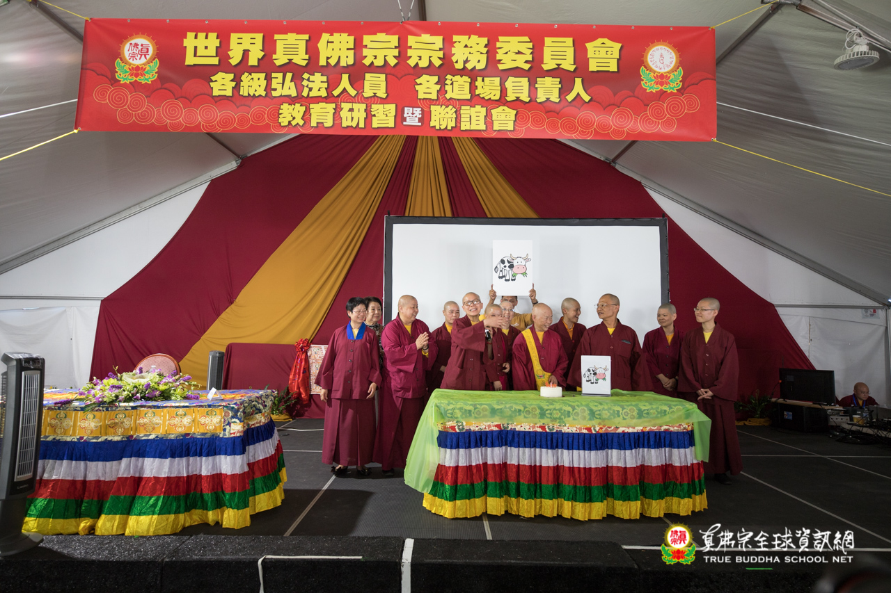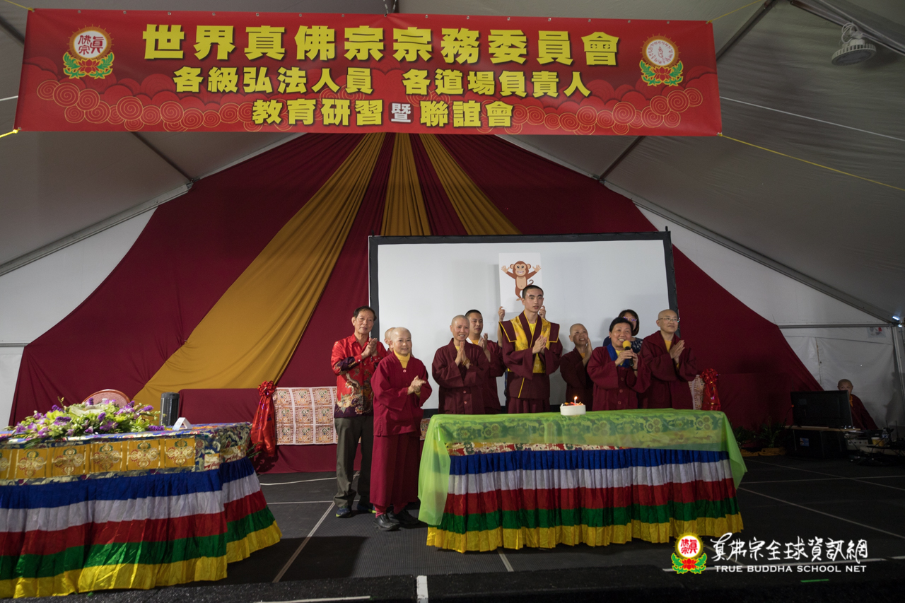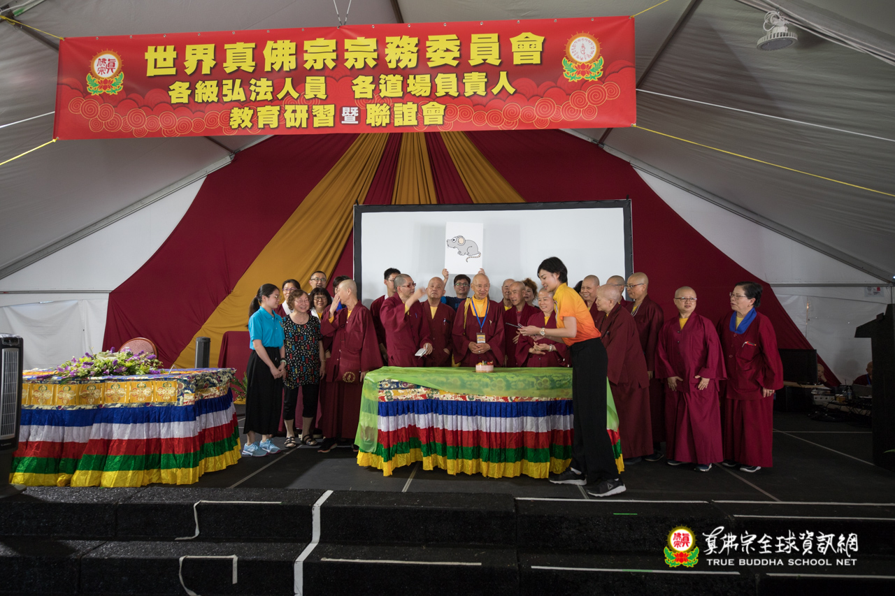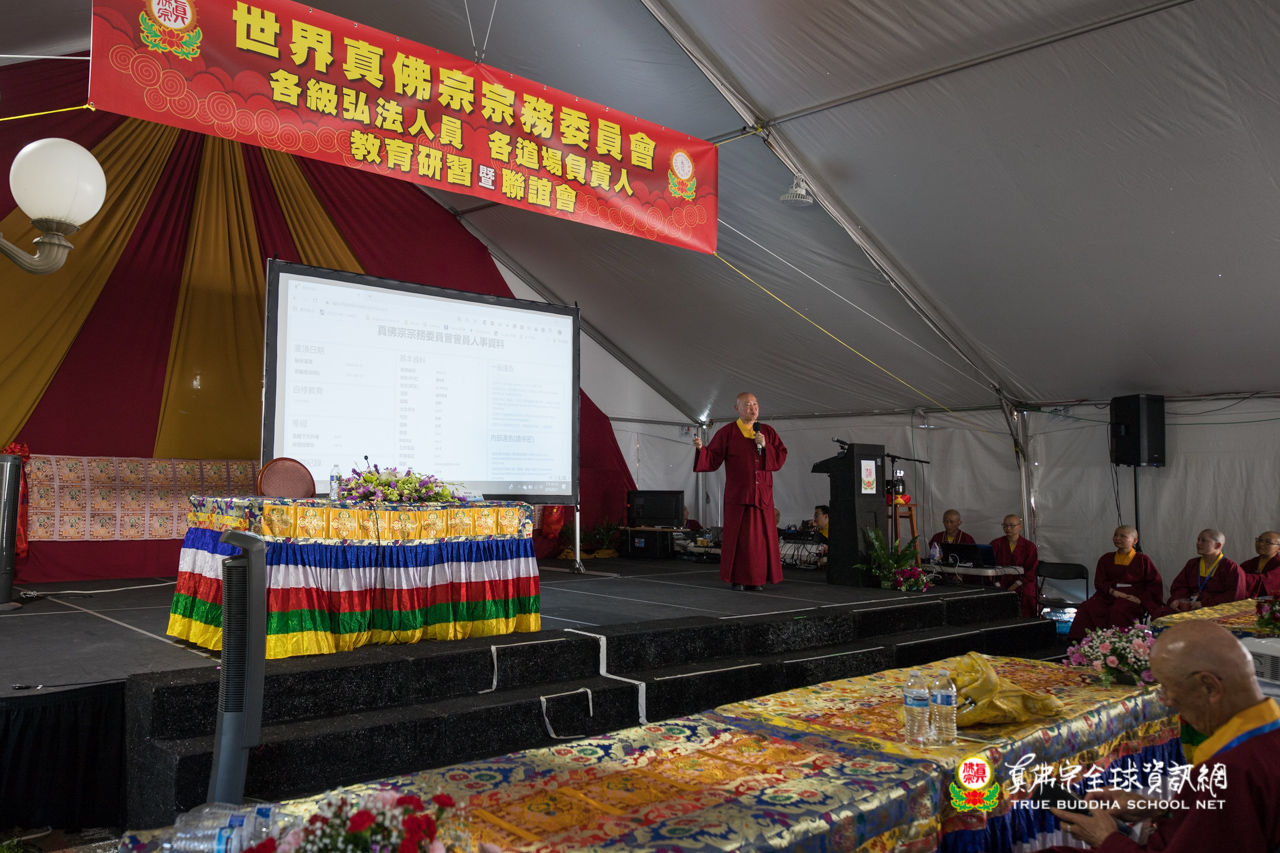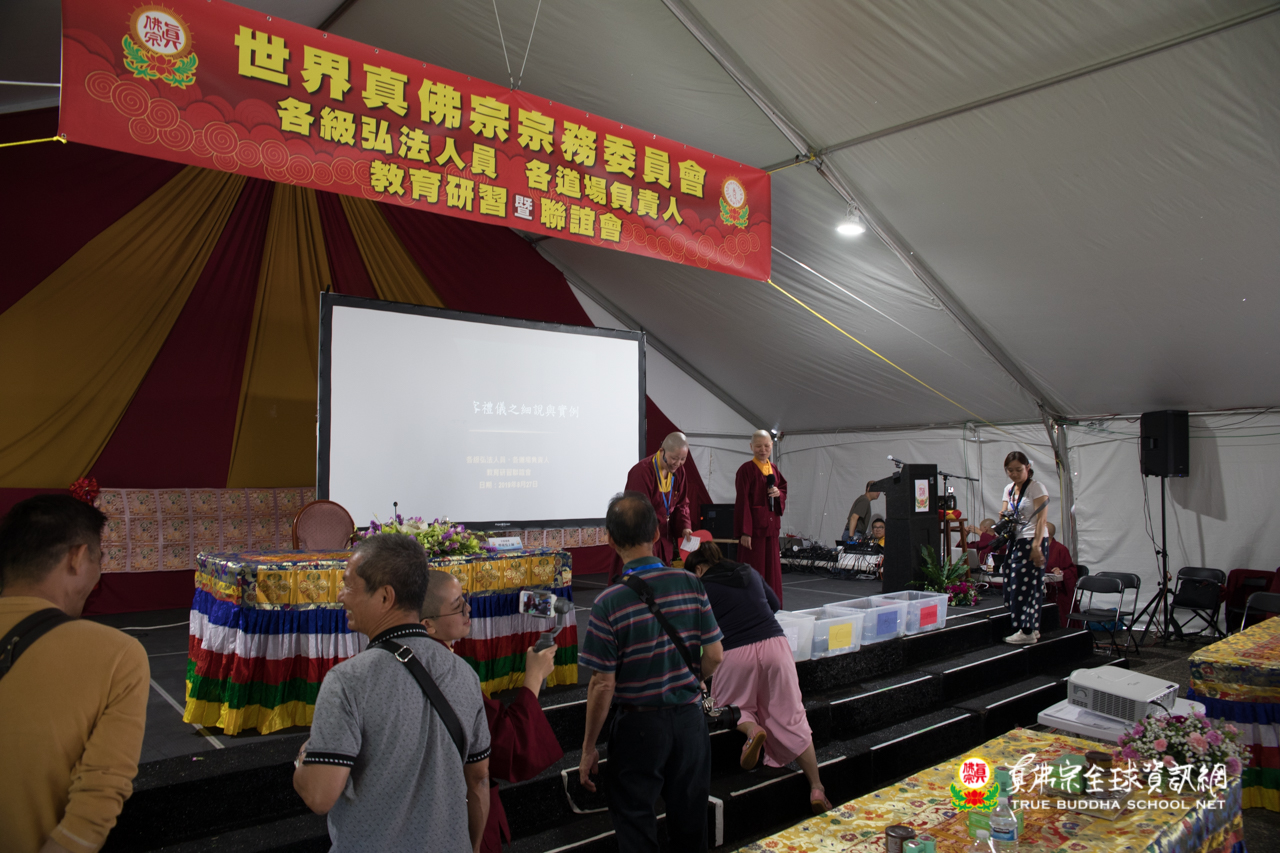 最後再由㑹長蓮花程祖上師致詞:上師說,在法會期間,宗委會為了要籌募款項,特別準備了師尊法像讓大家請購,竟然有人不認識宗委會,上師問大家都認識各位處長不?有問:「你們都愛我們宗委會嗎?」(大家抱以熱烈掌聲,大喊「愛」!)宗委會肩負很重大的責任,而建設宗派是各級弘法人員及各道場負責人的責任,會長希望大家一起來分擔,一起來規劃。真佛行者做任何事要馬上行動,要學師尊的精神。會長強調,在坐的每一位是宗派的希望,所以有了解自己、改變自己,希望各處長任務大家也要了解。希望以後大家隨時能找到宗委會,大家的心和宗委會的心是相連的。在台灣有一位上師捐地建宗委會辦公室,以後希望大家都來建設宗派,鼓勵大家來贊助宗委會,因為宗委㑹需要很多資糧。最後會長感謝彩虹雷藏寺的團隊、及幕後團隊,希望以後大家一起來建設,並讓大家給于他們熱烈掌聲,大家預約今年11月30日,12月1日在台灣再相聚。
