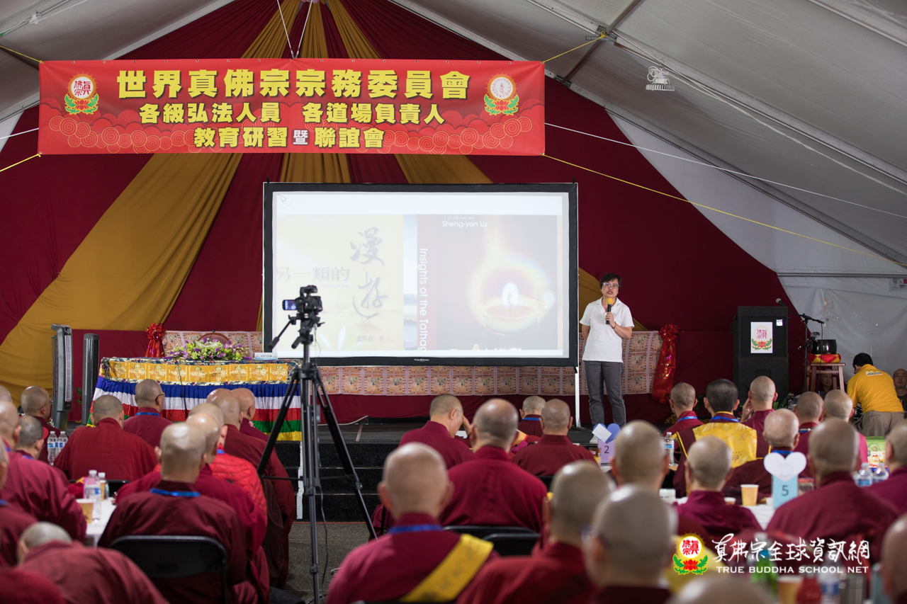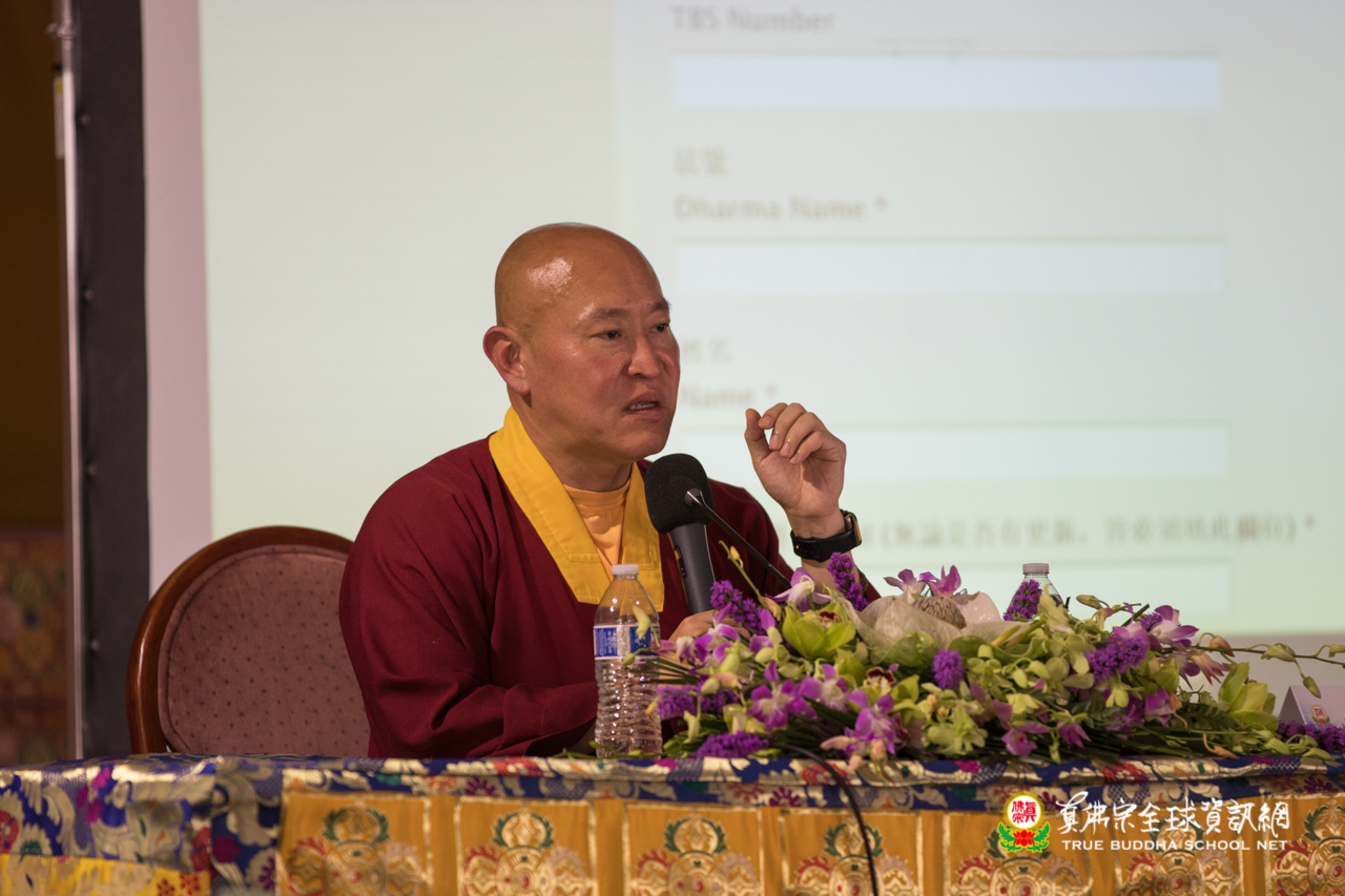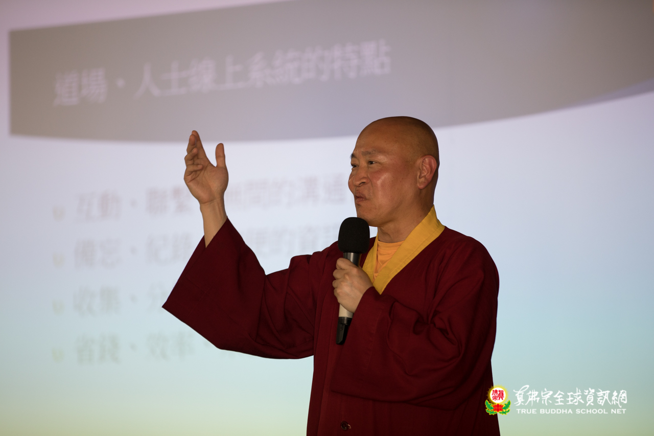 再接下來是由督察處蓮僧上師講《真佛宗弘法人員人事系統實作》。首先蓮僧上師要大家先加入真佛宗「人事道場線上互動系統」,在前二百名內還可以得到師尊的聖衣一片,請大家踴躍加入。開發此系統的原因是由於以前要想跟那一位法師連絡,都聯繫不上,找不到人,又法師們有話要説,宗委會也聽不到,所以宗委會做了很大的改革,以後任何資料都可以在線上系統解決,宗委會這次真的花了很多精力,很多時間處理及改革。線上系統有分許多介面,只要打進自己的真佛編號(編號由電腦自動編排,上師提醒不要讓他人知道你的號碼,而且這是永久的號碼),和自己的電郵,任何資料都很清楚的呈現出來。將來大家想查詢任何事,更為方便。上師希望仁波切、所有上師、教授師、法師、講師、助教、道場負責人、多多利用這線上系統。大家可上真佛宗講師、助教網站參考,蓮僧上師還希望所有弘法人員都一起努力建設,不要讓師尊失望,我們大家一起努力建設,把我們宗派弄得更好,要讓師尊住世的意念更強烈,我們一起加油!
