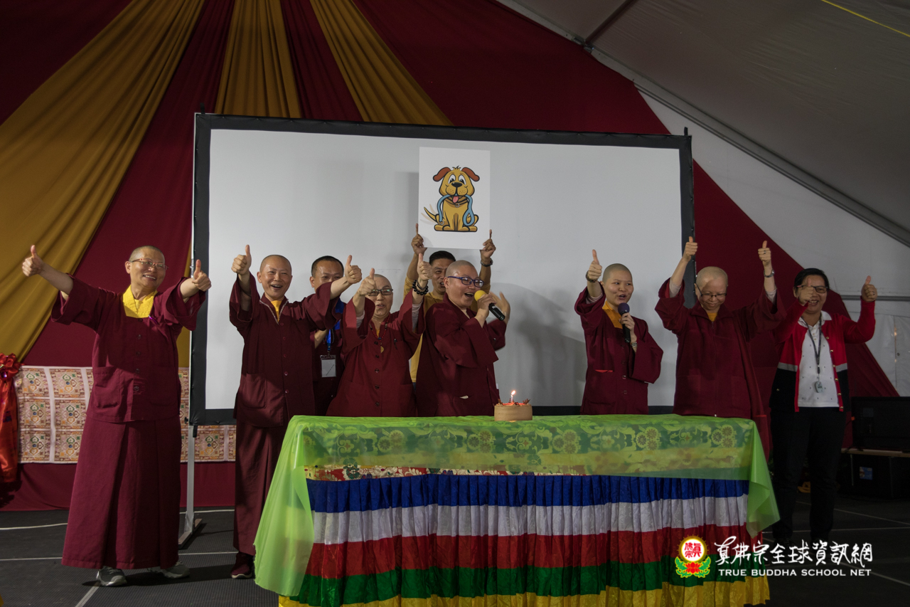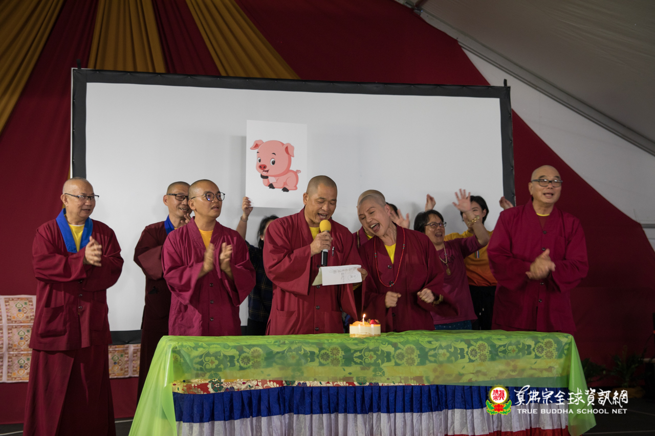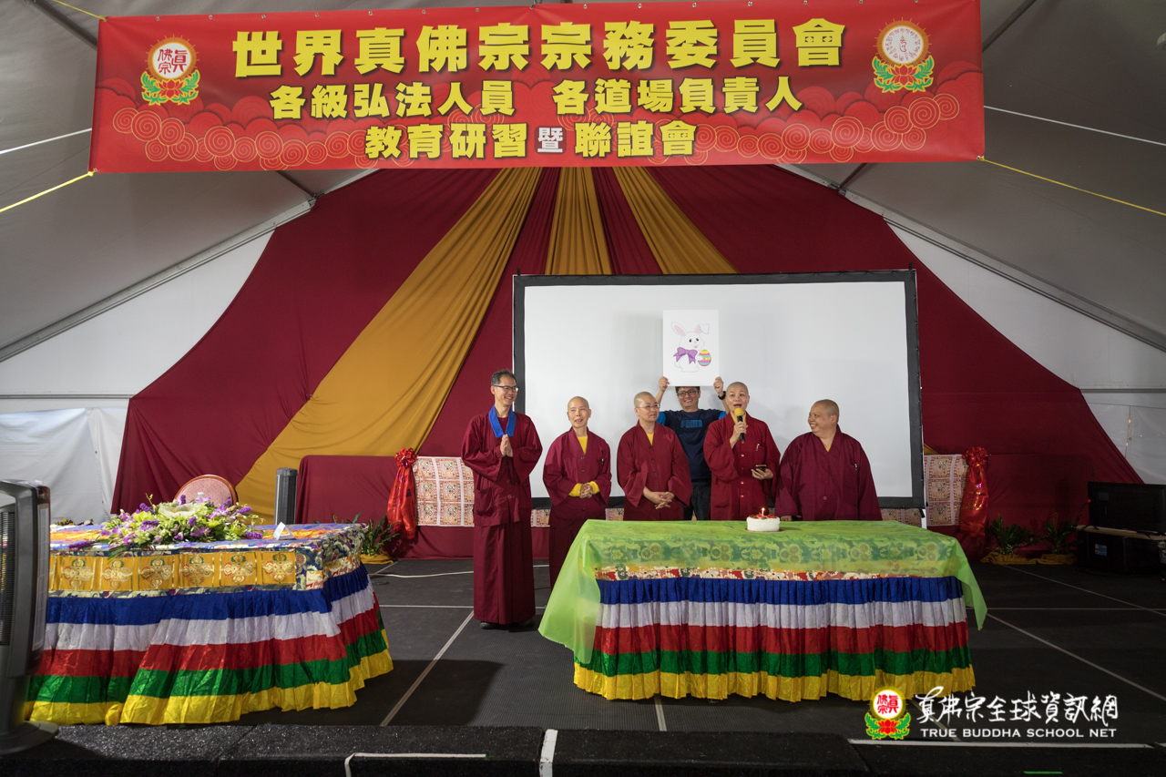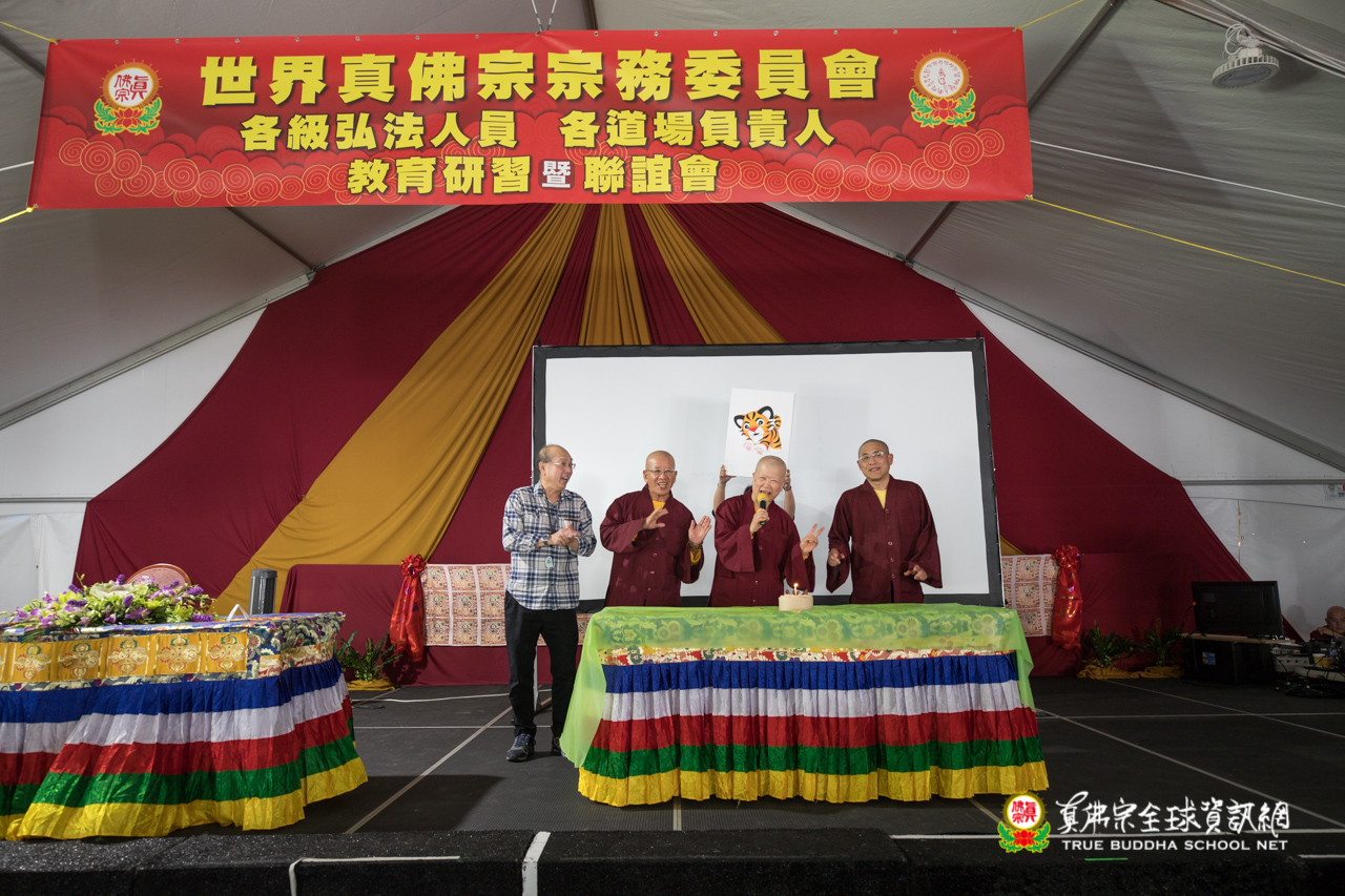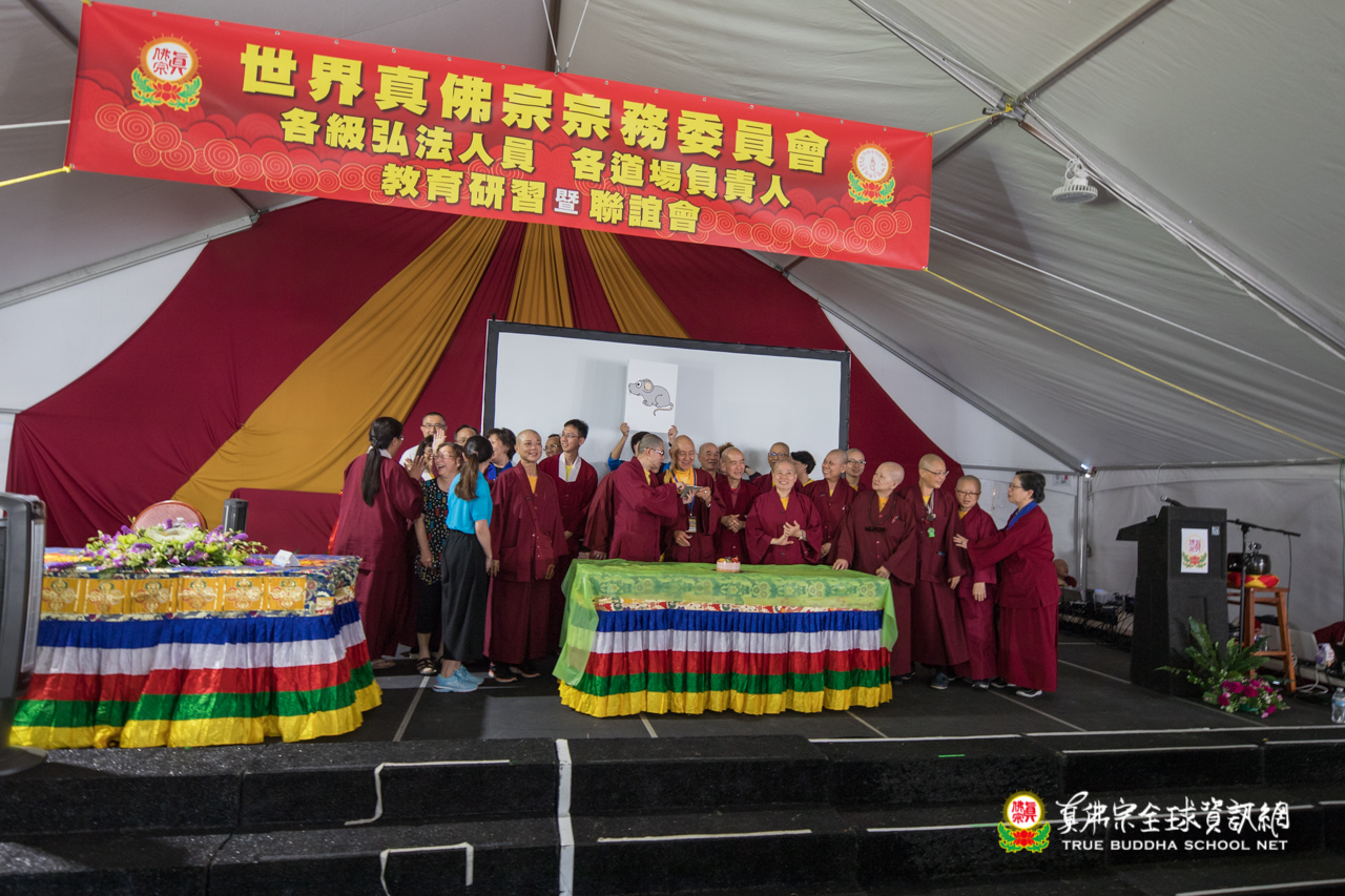 這次宗委會為了慰勞各級弘法人員及各道場負責人,最後還安排生日慶生會,特別訂製了精巧可愛的生肖生日蛋糕,為所有弘法人員及各道場負責人慶生,從生肖屬鼠的到生肖屬豬的,人人有份,都上台賀獻才藝表演,熱鬧非凡,接著先頒發結業証書,再由會長蓮花程祖上師頒發2019年新任講師及助教証書,場面太感人了!