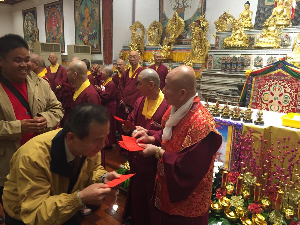 晚餐前,〈台灣雷藏寺〉蓮哲上師、台灣密教總會理事長蓮歐上師代表獻供祝賀師尊、師母新春快樂。