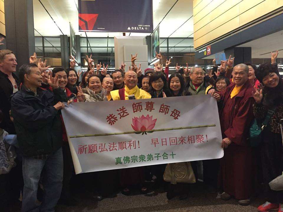 2014年11月14日晚間,蓮生活佛 盧勝彥在「西雅圖國際機場」即將返台弘法,西雅圖機場難得見到送機大陣仗;師母 蓮香上師、佛青、佛奇一家人,一一和師尊擁抱,祝願師尊返台弘法吉祥平安。