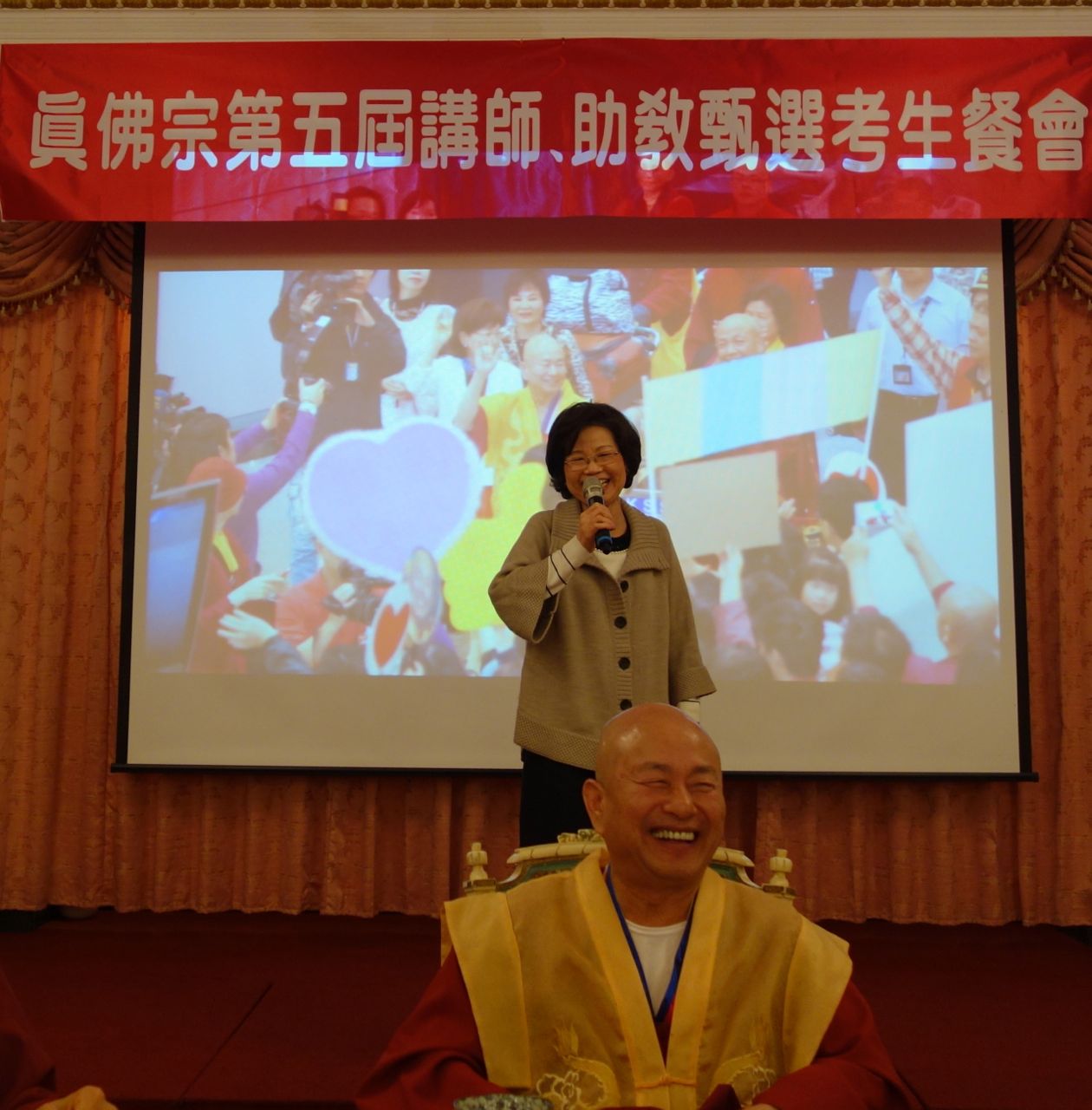 首先師母提到,就在今天下午由蓮寧上師和蓮店上師跟師尊師母報告了這一屆的應考學員的種種情形,也讚揚這屆的考生都非常優秀、懂得敬師、重法、實修的精神,體現出真佛宗的行者風範。師母聽了報告後心中也非常感動,所以如果今天師母是考官的話,就會讓所有的考生全部通過!當大家一聽到師母的這番話,馬上全場響起熱烈的歡呼及掌聲!
