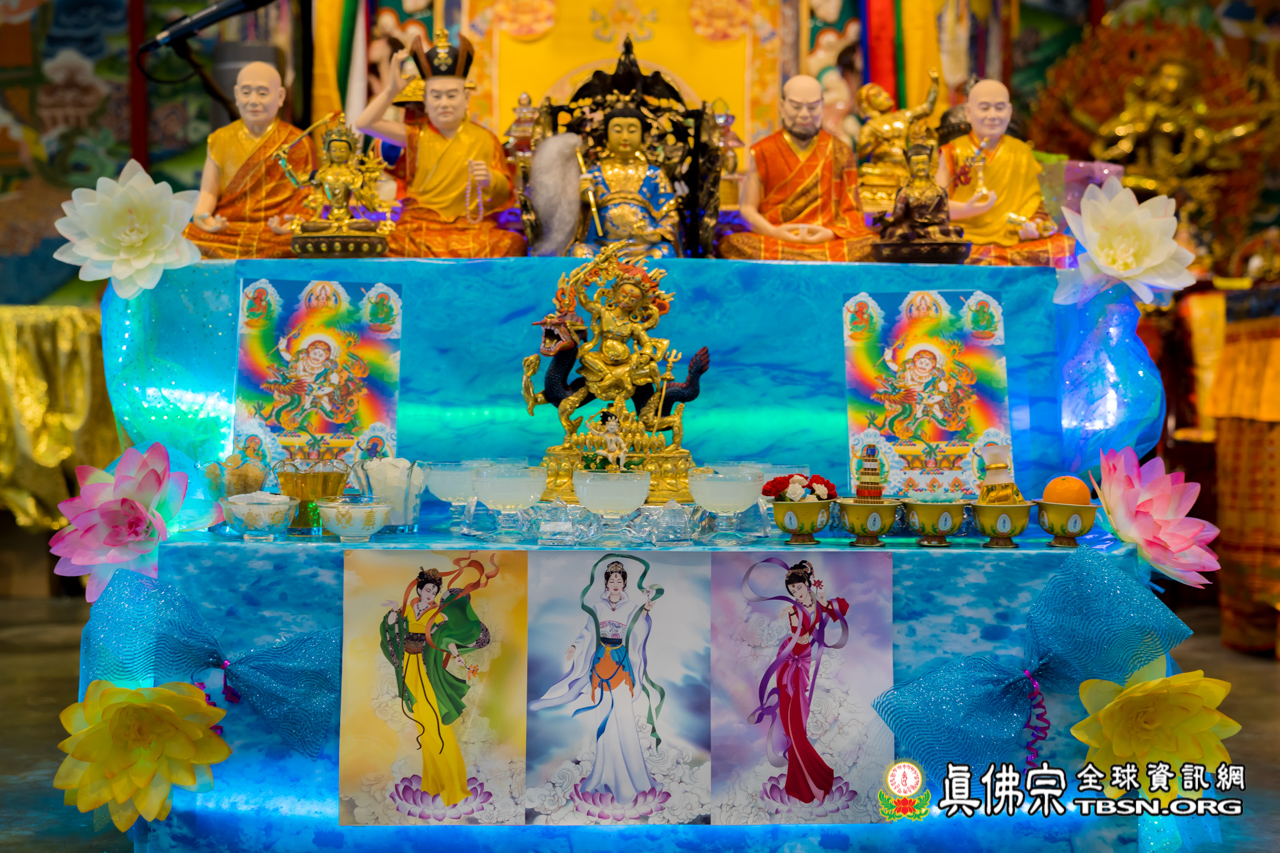 法王在開示中,再度教導大家修持白財神法的要訣和佈壇方式。白財神本身住的宮殿是水晶宮,「假如供上白色三角形的水晶,祂一看就歡喜,就等於回到祂自己的家一樣」,所以,白財神的壇城需要擺放七個水晶,每一個水晶當中要放七碗的沐浴水,沐浴水對白財神很重要,因為,騎龍白財神的嗜好就是就是沐浴,「這是最主要的壇城,你要沾沐浴水,再將沐浴水彈出去,沾一下表示說是你得到的,你得到這些財寶,是騎龍白財神賜給你的,然後觀想整個虛空中的money,全部降下來在你家裡,滿滿的。」