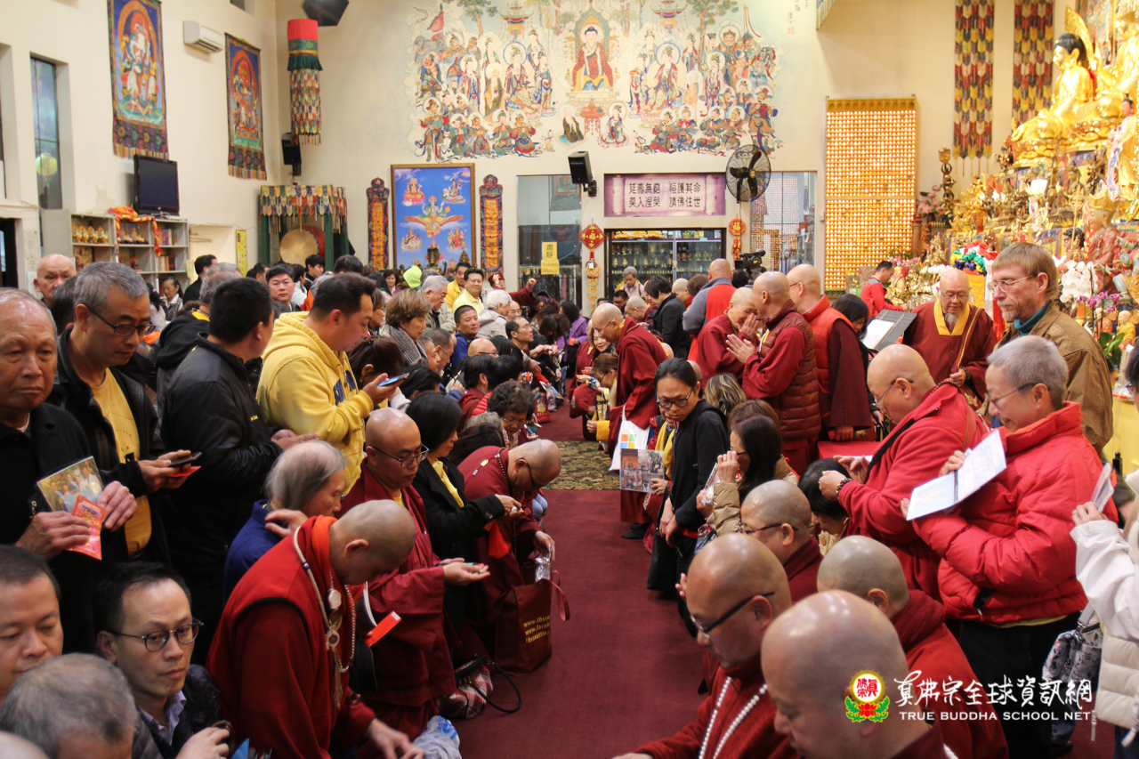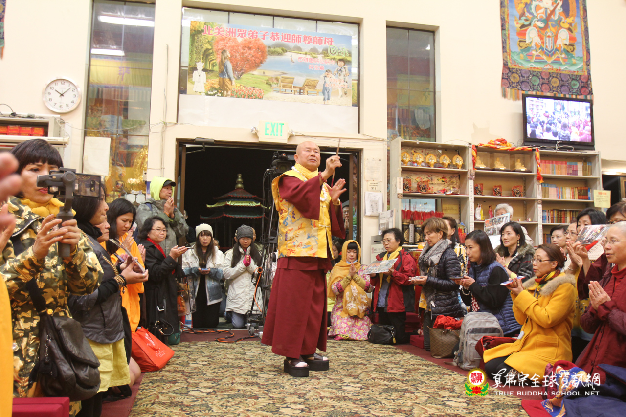 開示結束後,聖尊為大眾賜授皈依灌頂、加持大悲咒水和開光佛像。離開祖廟前,聖尊慈悲為大眾摩頂加持。聖尊是晚的開示,法音繞樑、法味縈繞,所有弟子們至誠感謝聖尊的教導,讓大家能明白無所得、無所失、無所畏懼的自在清明。