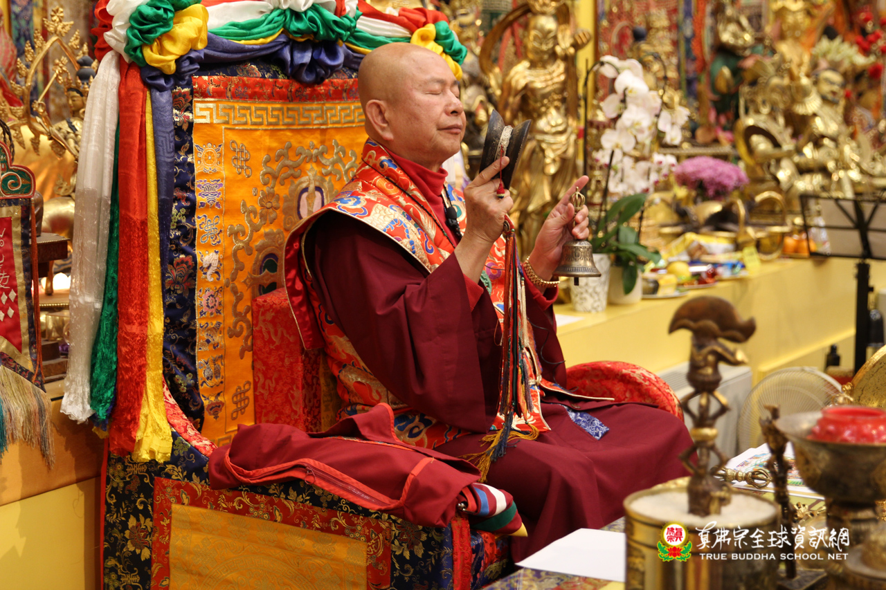 本周六同修主尊為八大本尊之一的蓮華生大士。聖尊於圓滿肅穆的同修後,開示談到蓮華生大士是西藏佛教第一位祖師爺,祂也代表著舊教。西藏第一座寺廟桑耶寺,是由藏王赤松德真、蓮華生大士、寂護大師三人一起合建。蓮華生大士在西藏弘法大約五十年,後來,祂將重要的口訣心要,伏藏在岩洞中、森林裡,及在虛空之中。有一個取藏的故事,是說在某年某月某日,租一條船航向湖心,等待時辰。就在那個時刻,突然之間會有一條大魚跳到船上,而魚的肚子裡居然有羊皮,羊皮上面留有蓮華生大士的心要口訣。