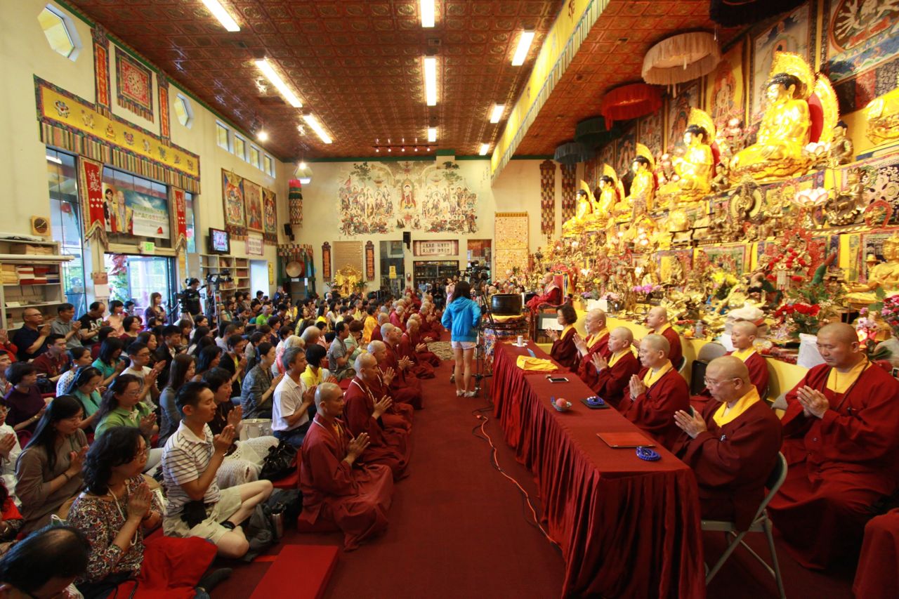 2014年6月21日週六,〈西雅圖雷藏寺〉壇城佈滿鮮花及各式供品,大家熱絡地準備同修。晚上八點許,善信齊聚,在司儀的帶領下,大眾專注持咒觀想,祈願藥師琉璃光王如來的賜福。