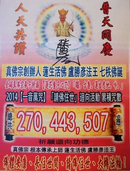 2014年6月19日「」,全球持誦「嗡。古魯。蓮生悉地。吽。」迴向蓮生活佛 盧勝彥無上法王七十佛誕,持咒活動總遍數270,559,479