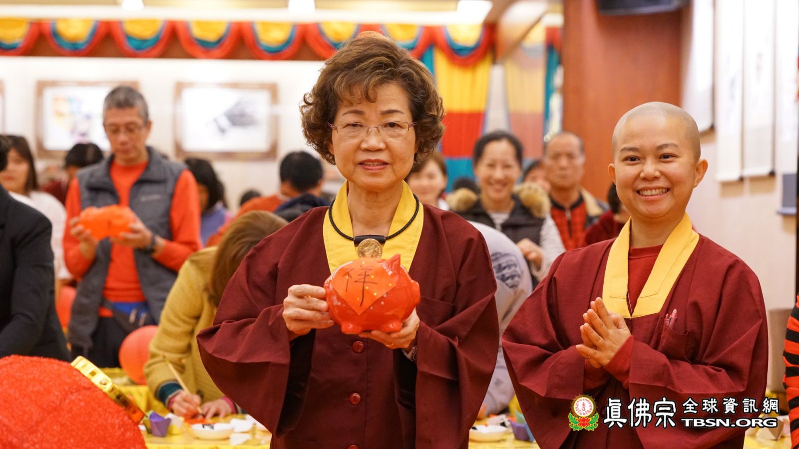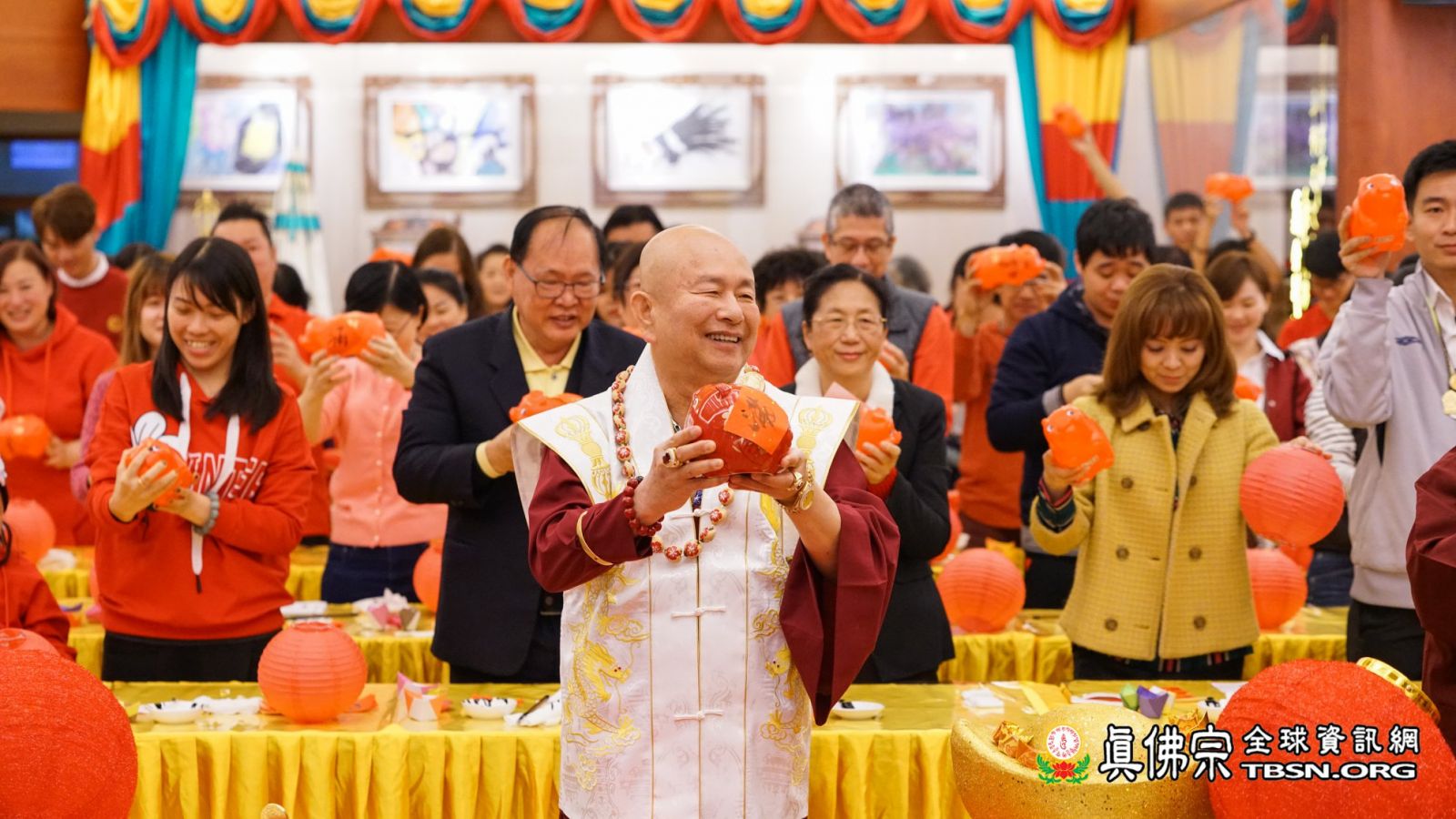 十一時許,法王蓮生活佛和師母蓮香金剛上師抵達台灣雷藏寺;弟子們見到了久違的師母,且精神飽滿地和師尊進行新春活動,諸弟子無不為她感到歡喜。師尊、師母先和大眾一起摺金元寶,願「金豬報喜!豬年吉祥!」而依師尊之前的開示,今年「接財神」要準備紅豬撲滿,主辦單位也準備了許多紅豬,及喜氣的紅燈籠讓大家題字;師佛先題了「滿」,象徵大眾「富貴滿滿,錢包滿滿」,再把「福」字倒貼在紅燈籠上,表示「福到了」!師母則在紅豬上題了個「祥」字,在紅燈籠上題了「吉」,呼應新年的「吉祥如意」!師尊和師母也跟大家一齊捧著紅豬和紅燈籠,喊道:「迎金豬,招財運,平安健康一整年!」令初一的台灣雷藏寺更顯得喜氣洋洋。