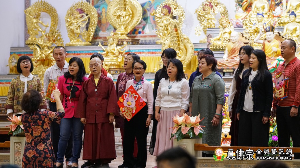 為了讓晚宴精采的節目順利進行,有三位主持人林素任助教、豆豆、和Victor同時,或接力輪流主持節目,讓場面活潑生動。從「上菜秀」 揭開序募,表演項目包括天音雅樂合唱團所唱的「祝福」與「讓自己消失掉」、小短劇、小寶貝的舞蹈表演「學貓叫」、Victor和雙蓮師姐等表演的「張三的歌」、及陽光舞供團的排舞。除此之外,還有現場遊戲節目和摸彩,讓在座的觀衆弟子們一起參與,大家沉浸在歡喜的新年氣氛。