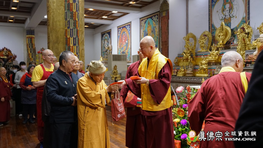 盧師尊與師母於4日下午六時左右抵達雷藏寺,師尊先向密壇諸佛菩薩上香,然後休息片刻後,隨即在密壇與近千名來自世界各地真佛弟子共同用餐圍爐。慈祥的師尊進入會場後,親切的到各個角落關心問候弟子們,熱情的弟子們感受到從盧師尊問候中流出的滿滿溫暖,整個時間超過二十分鐘,師尊師母才順利就座。接續,由密教總會理事長蓮歐上師和台灣雷藏寺住持蓮哲上師,代表四眾弟子敬獻供養給師尊、師母。