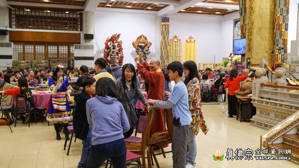主辦單位邀請天音雅樂合唱團及陽光舞供團表演,還有各地同門弟子供養表演項目,主辦單位也安排了現場遊戲節目及幸運大抽獎。整個餐會更在 聖尊蓮生活佛敲「吉祥鼓」與打「金剛棍」的大加持下達到最高潮,最幸福的事還是由師尊手中領受紅包,「一元復始,萬象更新」,及賜財旺健康符。