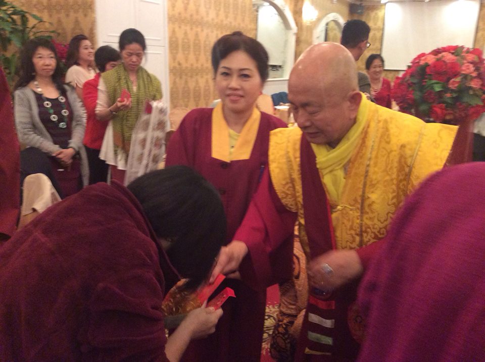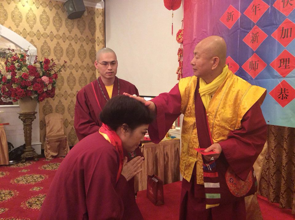 蓮簡上師介紹說:依照新加坡的習俗新年是要向長輩獻上橘子代表祝福。所以弟子們也都向師尊師母獻上吉利的橘子。