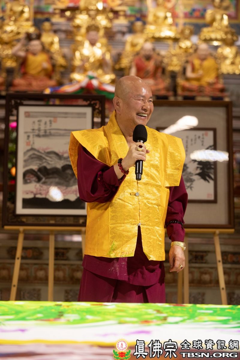 此次法王作家創作有別於前,首次嚐試以壓克力顏料方式揮灑彩墨,主辦單位大燈文化現場搭配鋼琴、古箏音樂演奏及天女獻舞,使會場充滿文藝氣息,同時穿插江南四大才子劇情演出,幽默逗趣。與會信眾盡情觀賞法王神來之筆,自然天成。