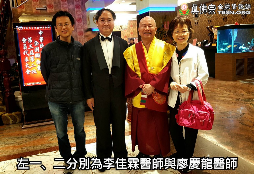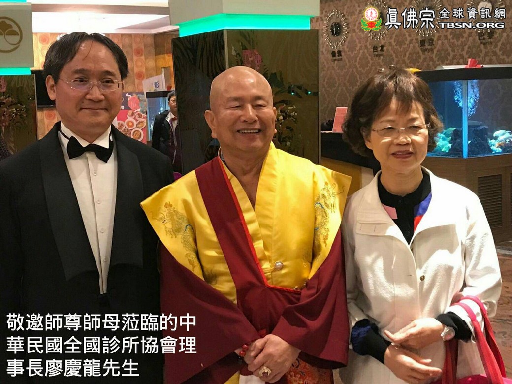 2019年1月6日,聖尊師母蒞臨一場極盛大的台灣醫師們聯合會,該場盛會近二千人參加。該單位理事長廖慶龍醫師是骨科醫術界的翹首,長期以來,為真佛宗法師們醫治服務,功德無量。師尊師母十分感恩,特別聯袂蒞臨廖理事長的盛會,亦表達感謝之意。廖理事長十分驚喜,與師尊師母致意,並且合影留念。現場還有真佛弟子李佳霖醫師與聯絡此行的王資主公關。