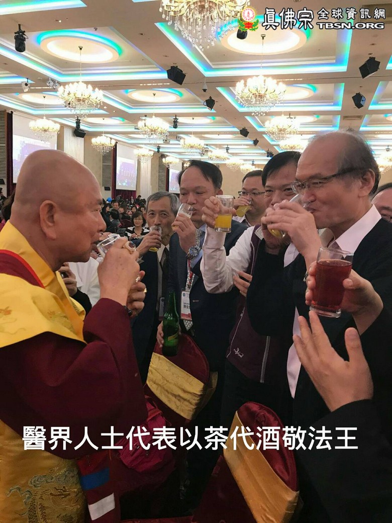 是日盛會,廖理事長很恭敬地請師尊師母坐上主桌,與眾有名的大醫院院長們同席。現場有很多第一次見到師尊的醫師們,紛紛趨前問候,向師尊討名片,合影拍照,令師佛一時之間,發完自己所帶來的所有名片。眾人還絡繹不絕地前來問候致意,連師母也翻開自己皮夾,終於找到一張師尊名片,遞呈師尊送給來者,對方才滿心歡喜離開。可見師尊即使蒞臨宗外場合,真佛魅力十足,仍然十分吸引眾人目光,然而,師尊並不會高踞自傲,反而更親切待人,真佛身教言教,高山仰止,真是眾生之垂範。