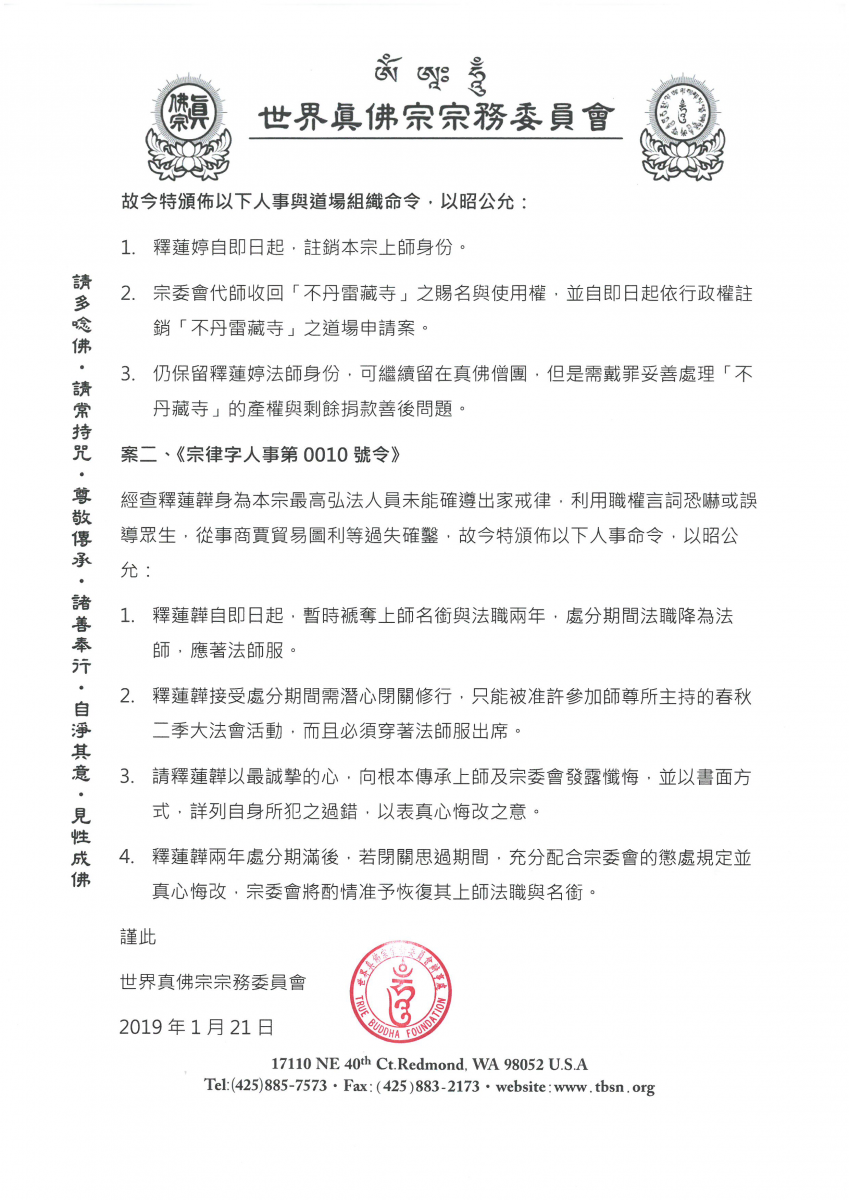 1.《宗律字人事第0009號令》_「釋蓮婷違反傳承,故註銷其本宗上師身份,降職為法師案」《宗律字道場第0003號令》_「撤銷「不丹雷藏寺」道場申請案」。
