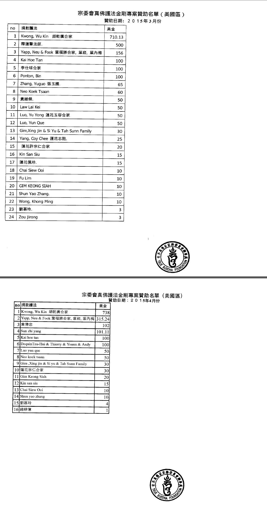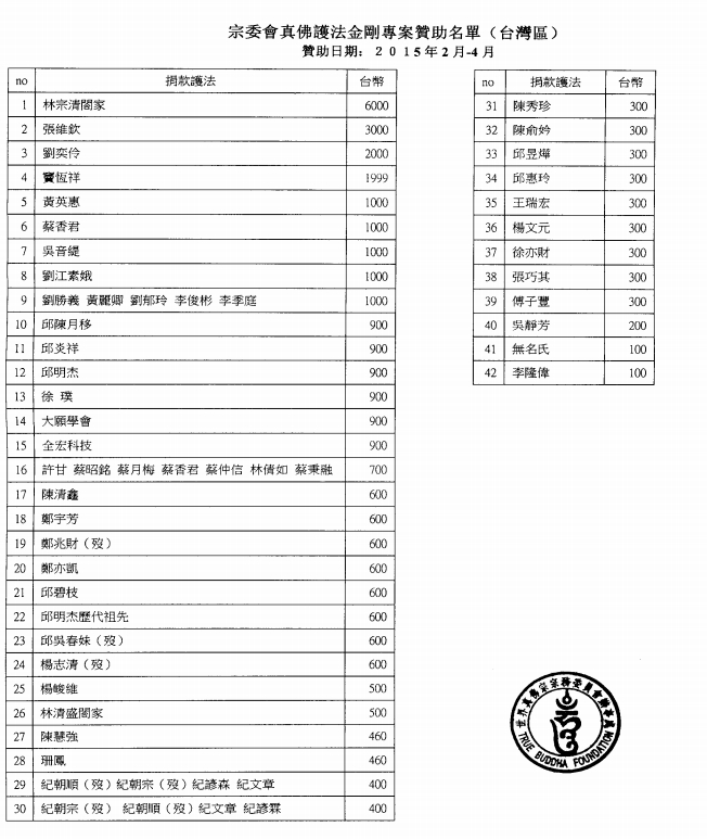 【宗委會 通告】感恩 蓮生活佛 盧勝彥法王慈悲加持2015.1.1 ~4.30【真佛護法金剛榜】贊助者名單