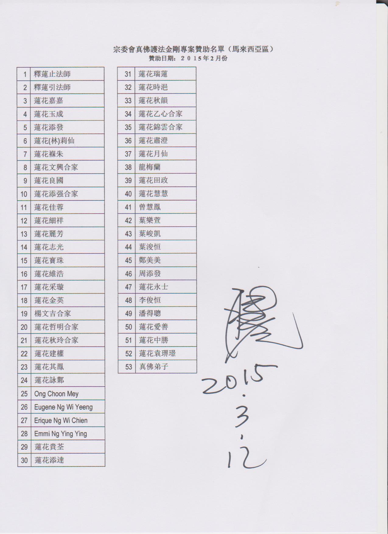 【宗委會 通告】感恩 蓮生活佛 盧勝彥法王慈悲加持2015.1.1 ~2.28【真佛護法金剛榜】贊助者名單