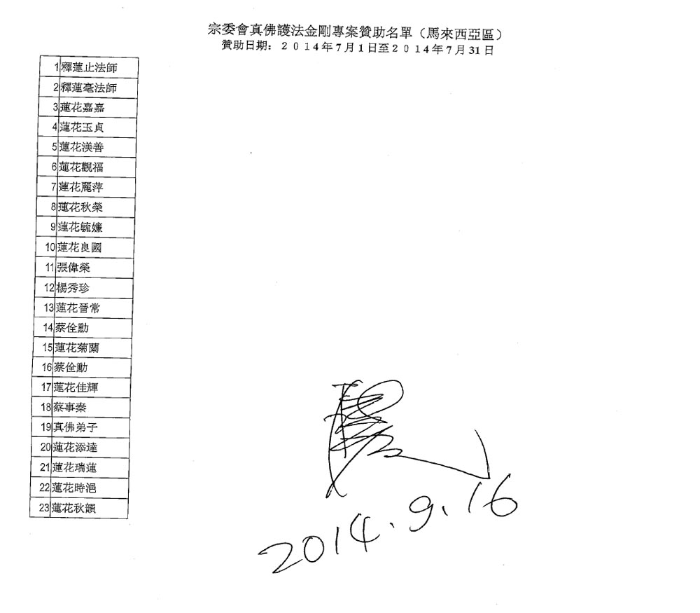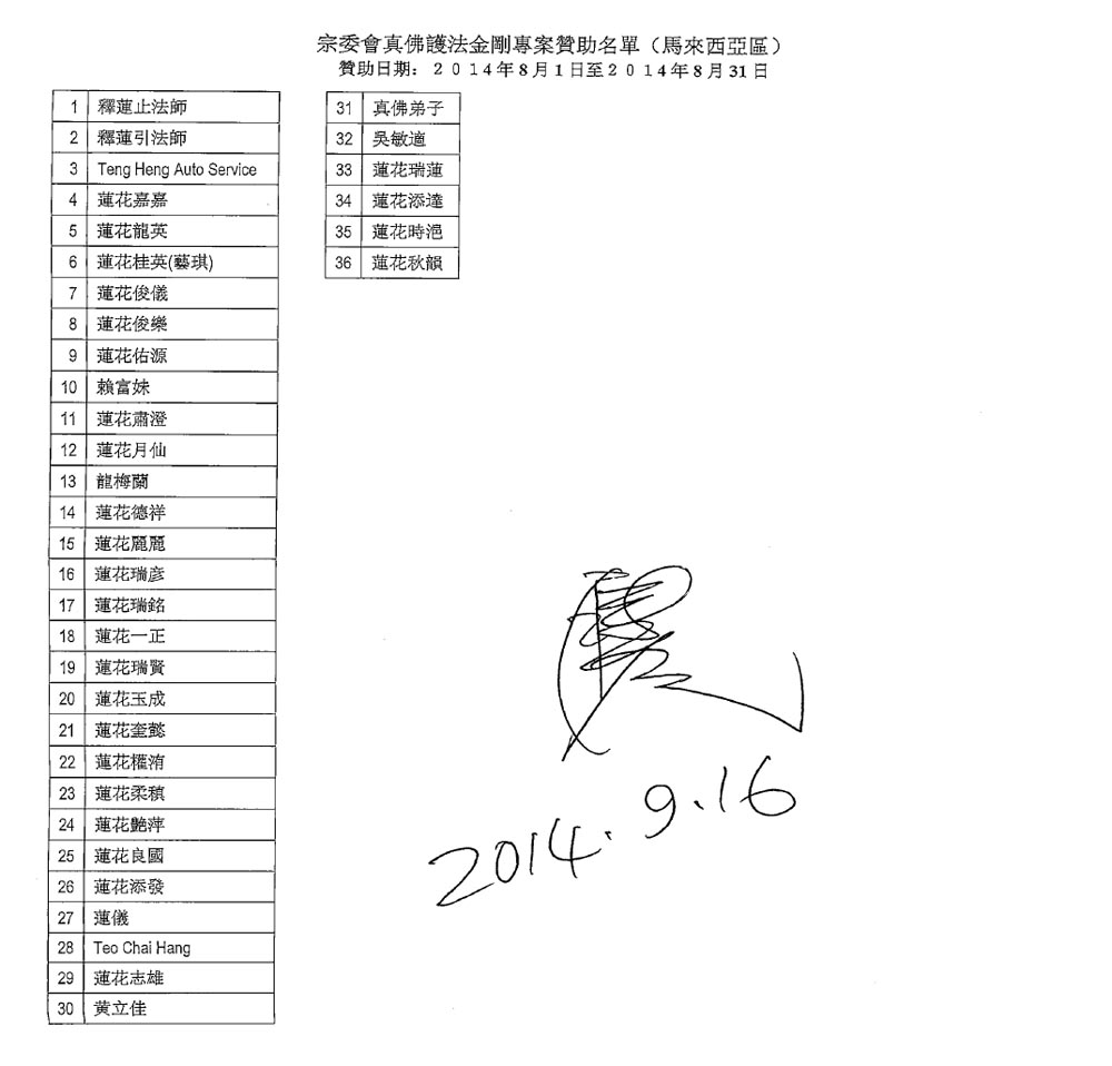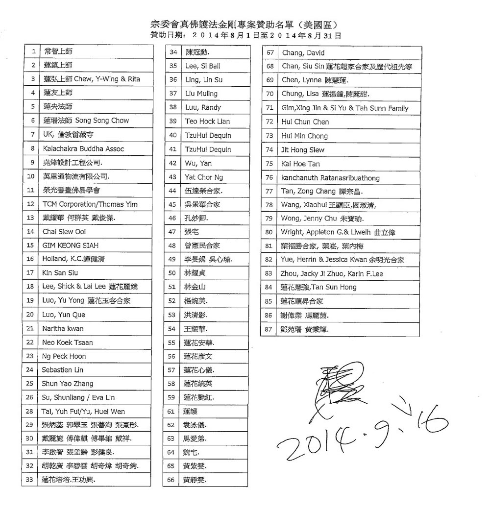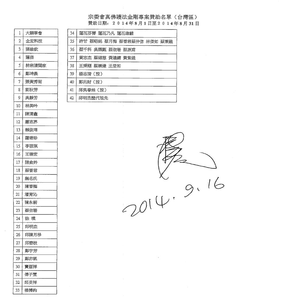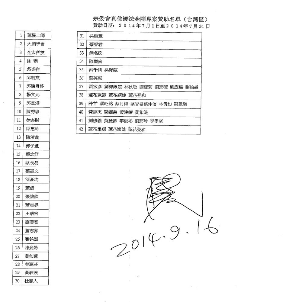 【宗委會 通告】感恩 蓮生活佛 盧勝彥法王慈悲加持2014.7.1 ~8.31【真佛護法金剛榜】贊助者名單