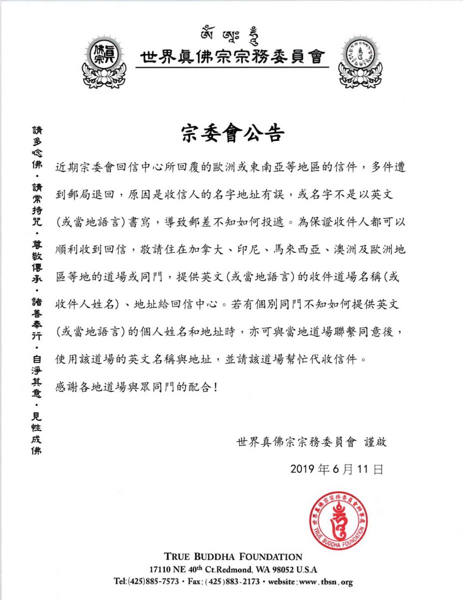近期宗委會回信中心所回覆的歐洲或東南亞等地區的信件,多件遭到郵局退回,原因是收信人的名字地址有誤,或名字不是以英文(或當地語言)書寫,導致郵差不知如何投遞。為保證收件人都可以順利收到回信,敬請住在加拿大、印尼、馬來西亞、澳洲及歐洲地區等地的道場或同門,提供英文(或當地語言)的收件道場名稱(或收件人姓名)、地址給回信中心。若有個別同門不知如何提供英文(或當地語言)的個人姓名和地址時,亦可與當地道場聯繫同意後,使用該道場的英文名稱與地址,並請該道場幫忙代收信件。