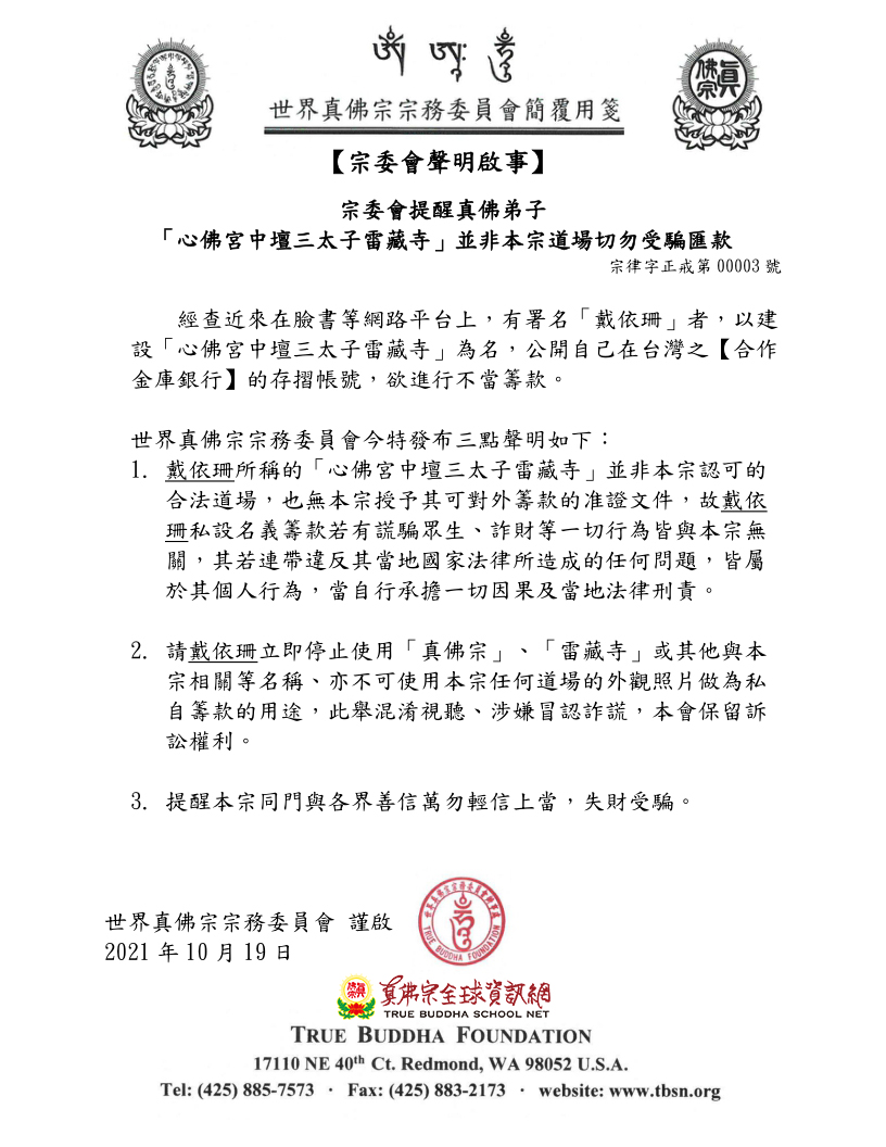 宗委會提醒真佛弟子「心佛宮中壇三太子雷藏寺」並非本宗道場切勿受騙匯款
