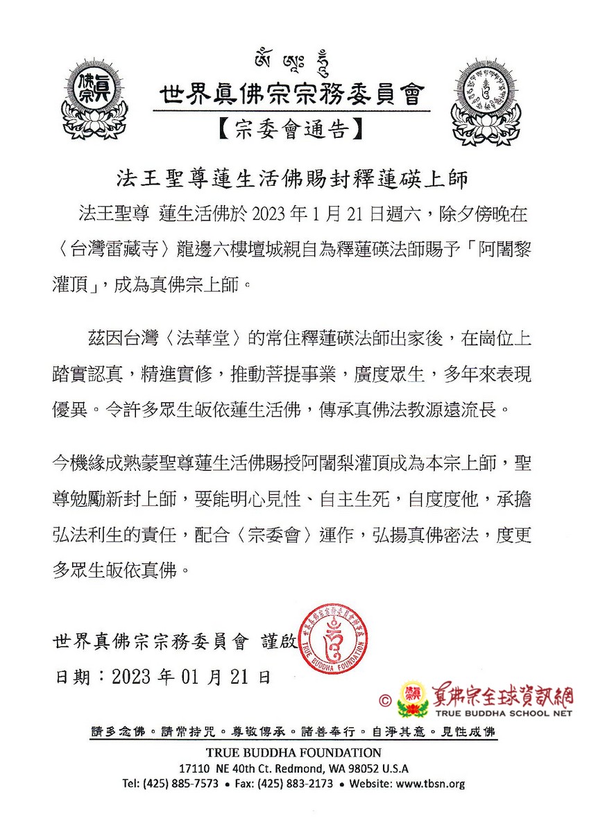 法王聖尊蓮生活佛於2023年1月21日週六,除夕傍晚在〈台灣雷藏寺〉龍邊六樓壇城親自為釋蓮碤法師賜予「阿闍黎灌頂」,成為真佛宗上師。