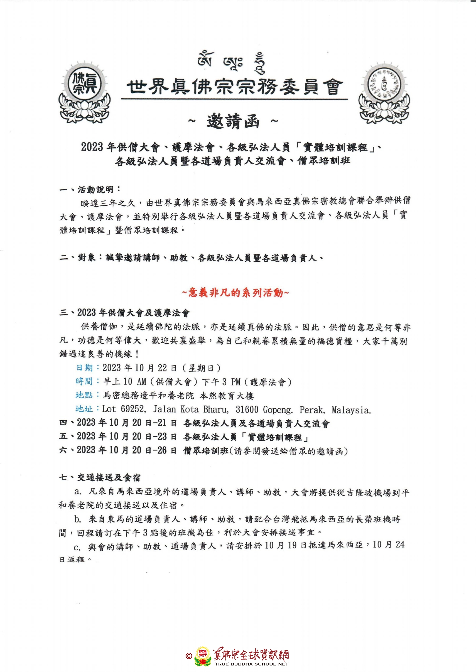 睽違三年之久,由世界真佛宗宗務委員會與馬來西亞真佛宗密教總會聯合舉辦供僧大會、護摩法會,並特別舉行各級弘法人員暨各道場負責人交流會、各級弘法人員「實體培訓課程」暨僧眾培訓課程。
