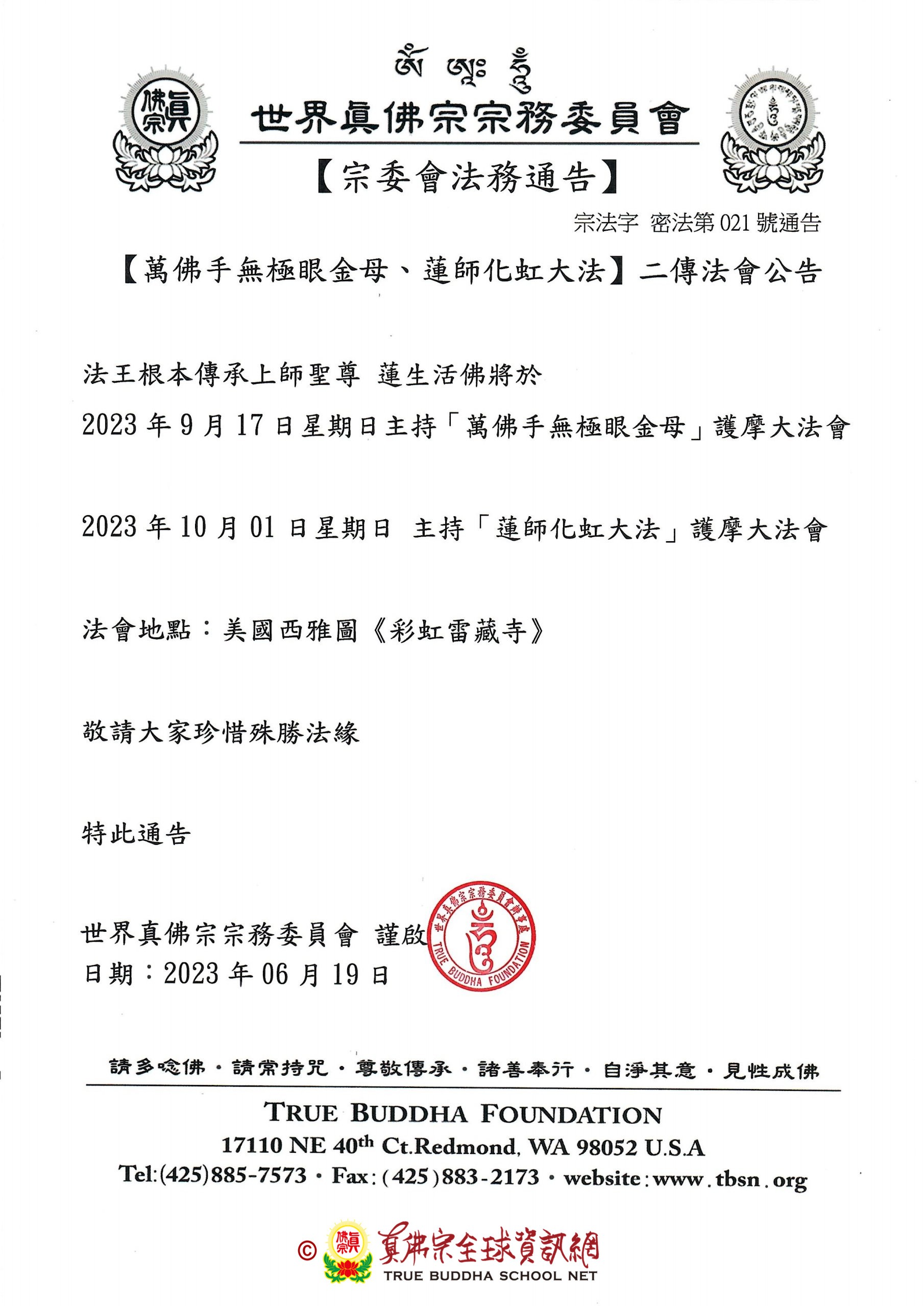 【宗委會法務通告】萬佛手無極眼金母、蓮師化虹大法二傳法會公告