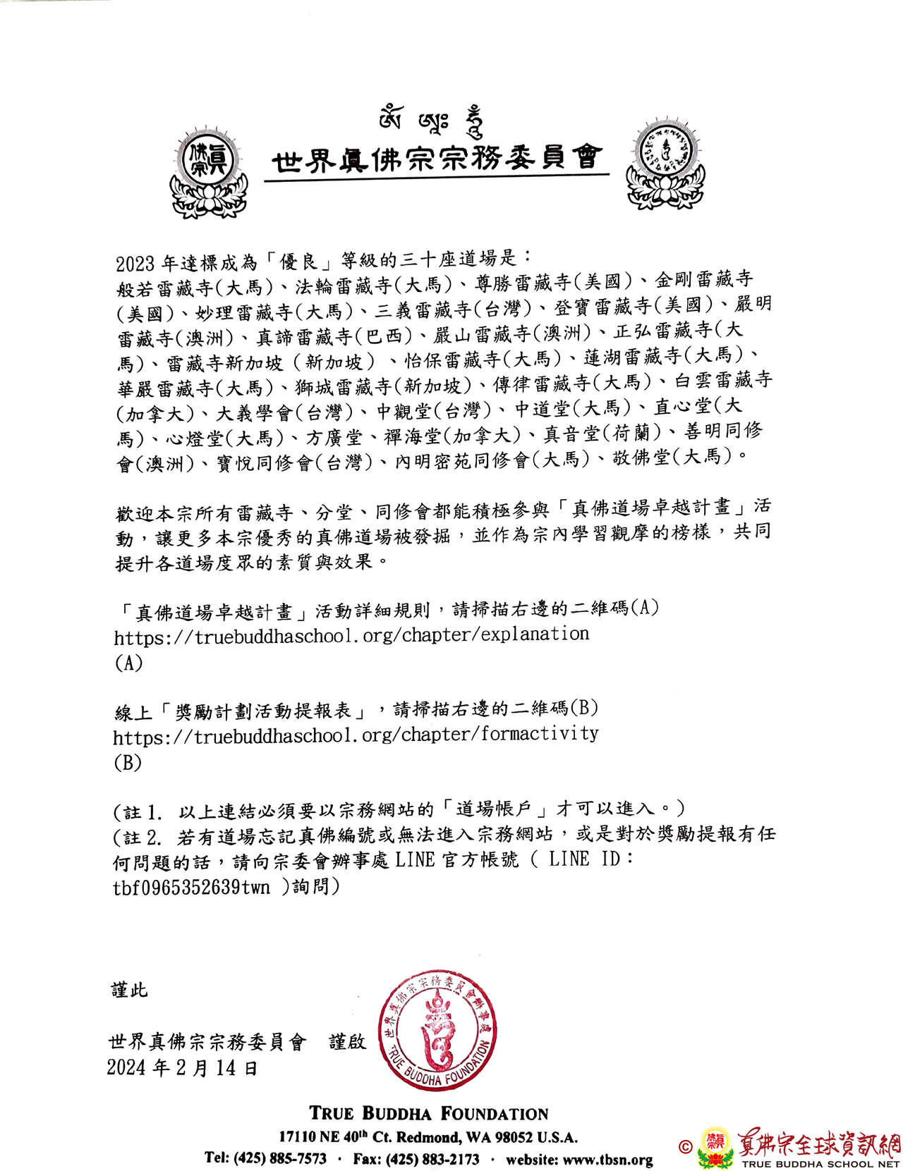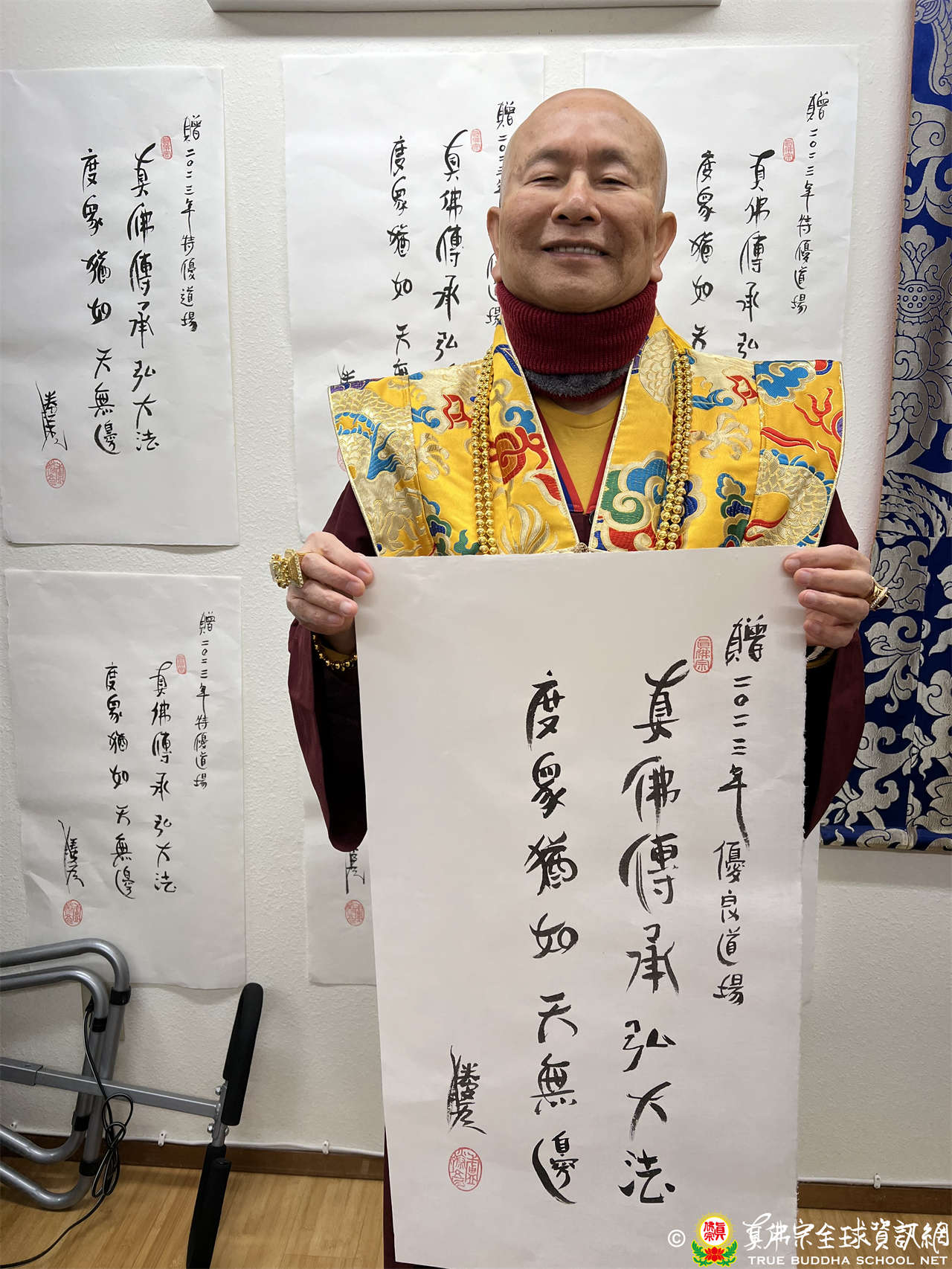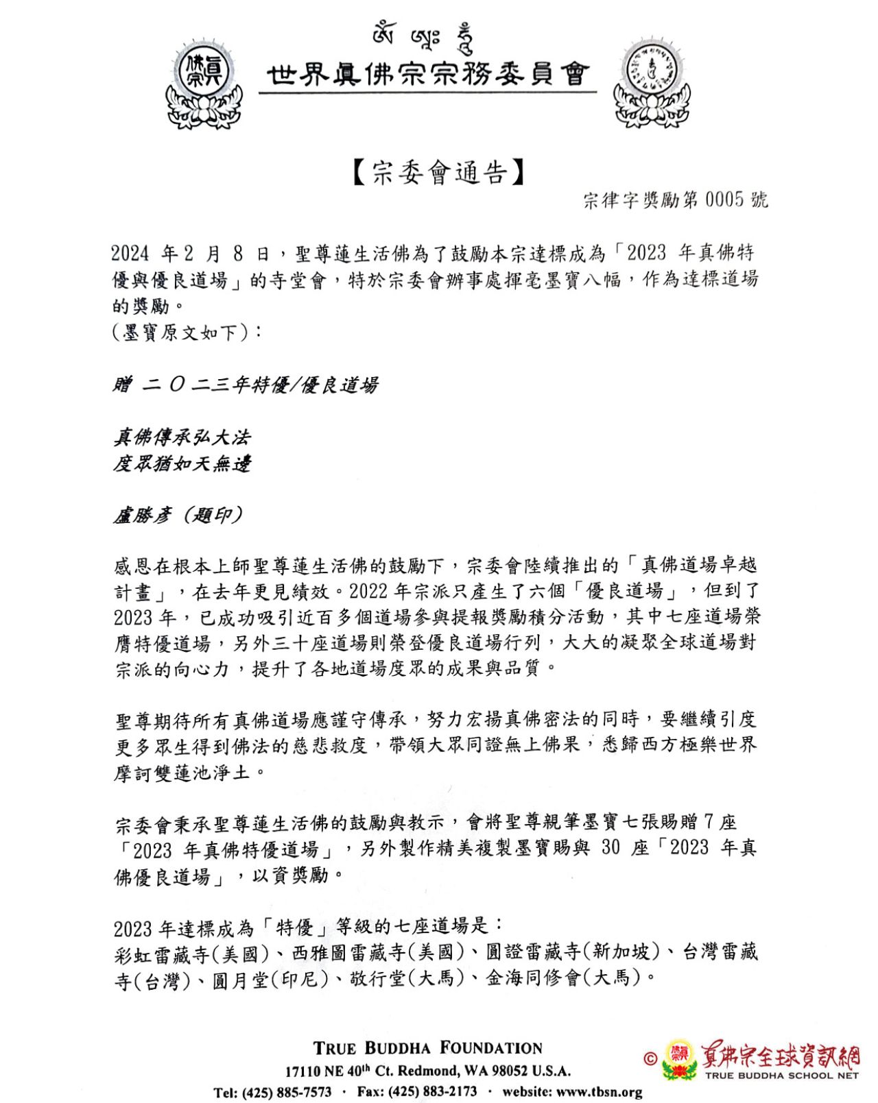 宗委會秉承聖尊蓮生活佛的鼓勵與教示,會將聖尊親筆墨寶七張賜贈7座「2023 年真佛特優道場」,另外製作精美複製墨寶賜與 30 座「2023 年真佛優良道場」,以資獎勵。