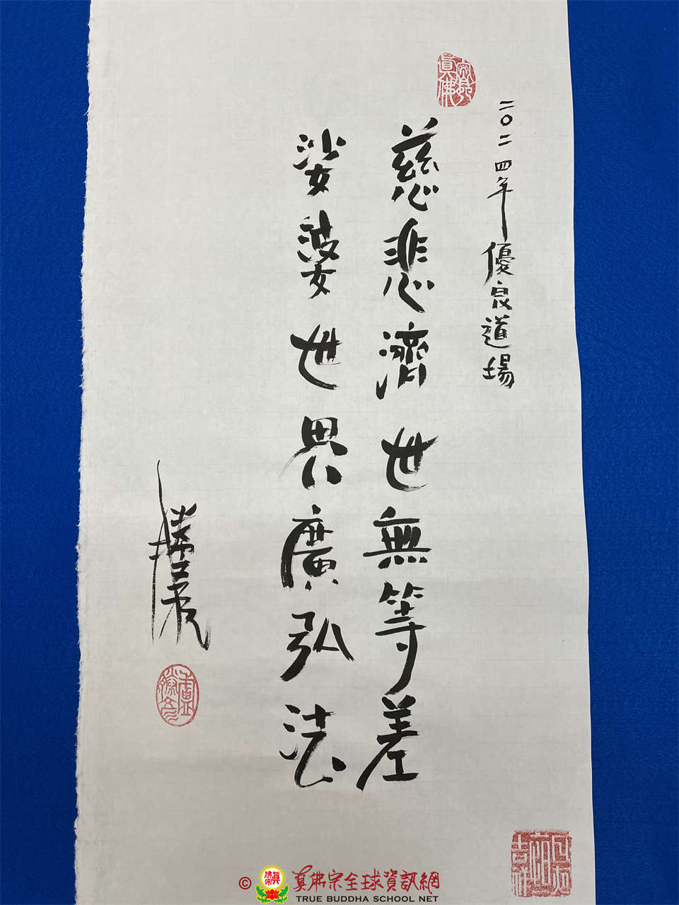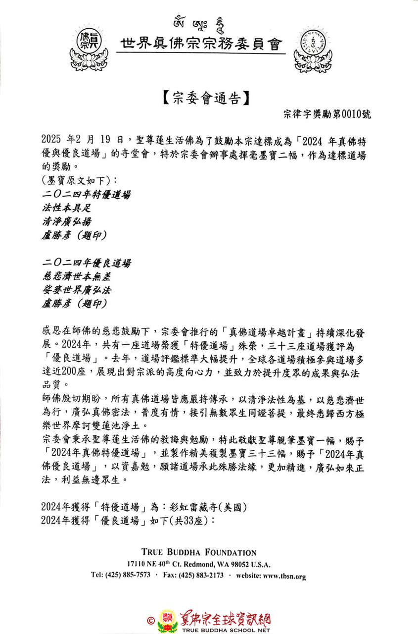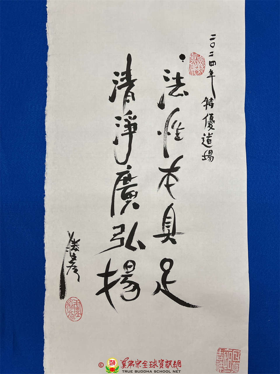 宗委會秉承聖尊蓮生活佛的教誨與勉勵,特此敬獻聖尊親筆墨寶一幅,賜予「2024年真佛特優道場」,並製作精美複製墨寶三十三幅,賜予「2024年真佛優良道場」,以資嘉勉,願諸道場承此殊勝法緣,更加精進,廣弘如來正法,利益無邊眾生。