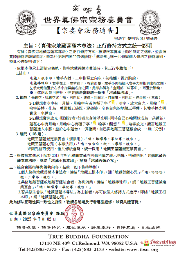 主旨:〈真佛宗地藏菩薩本尊法〉正行修持方式之統一說明