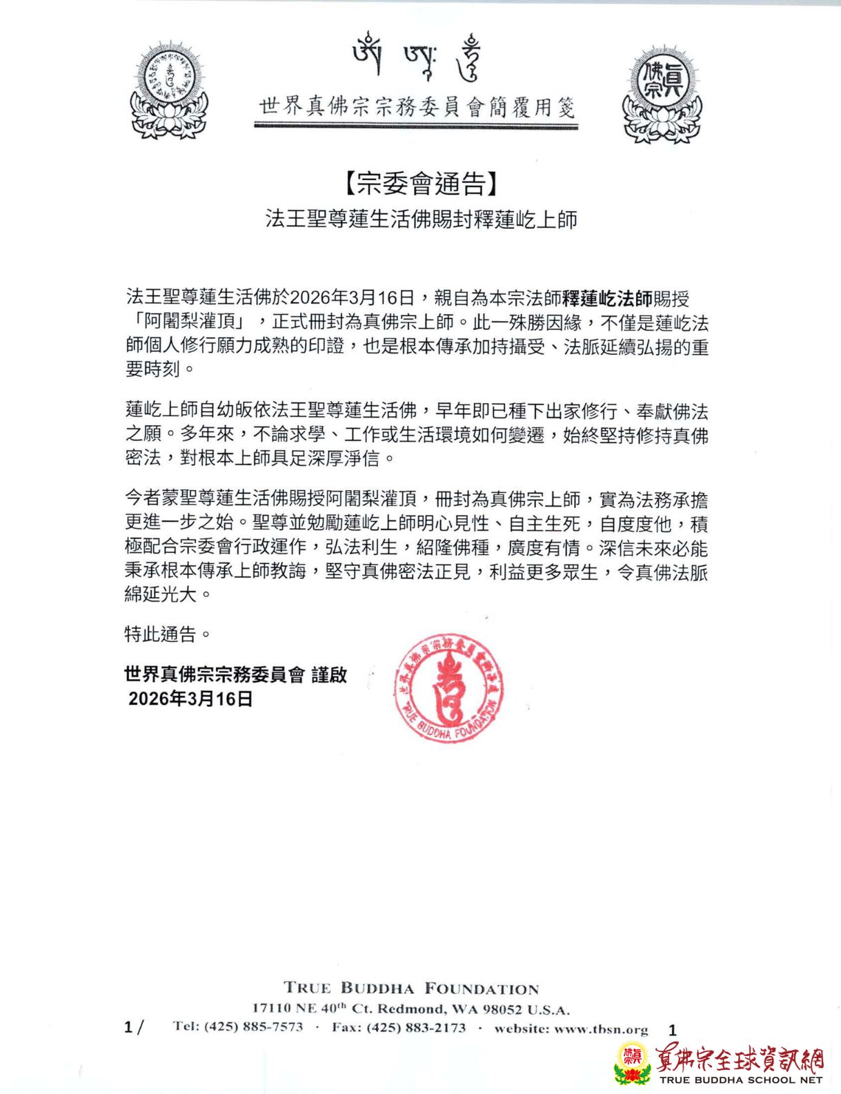 法王聖尊蓮生活佛賜封釋蓮屹上師