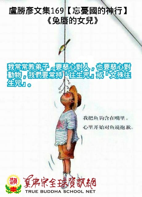 現在,弟子夫婦生了一個「兔唇」的女兒,我入其夢中告之說:「這正是因緣果報來了,你釣魚的鉤子,鉤傷了魚的唇口,雖然放其生,但仍然痛哉!你的女兒,兔唇難免手術了。」