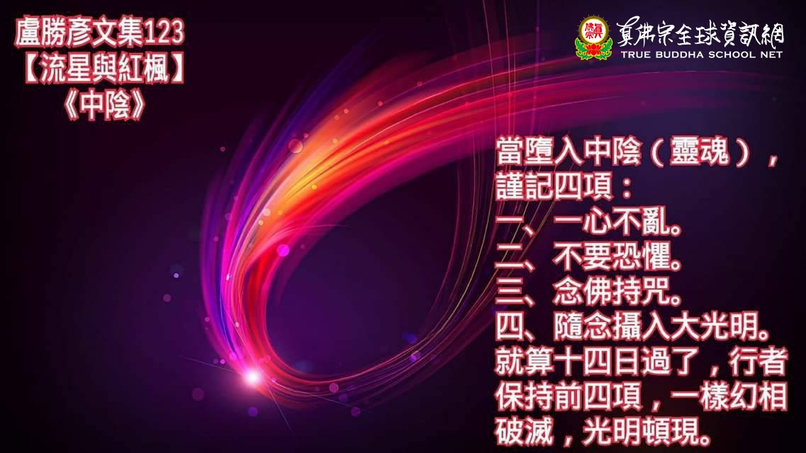 最害怕的是,一般人一入中陰(靈魂),如同夢幻,心大恐怖,不能自主,迷迷糊糊,無法自救,反而隨著自己的業力牽纏,跟著柔弱、微淡、煙霧之光而去,這就墮落了。