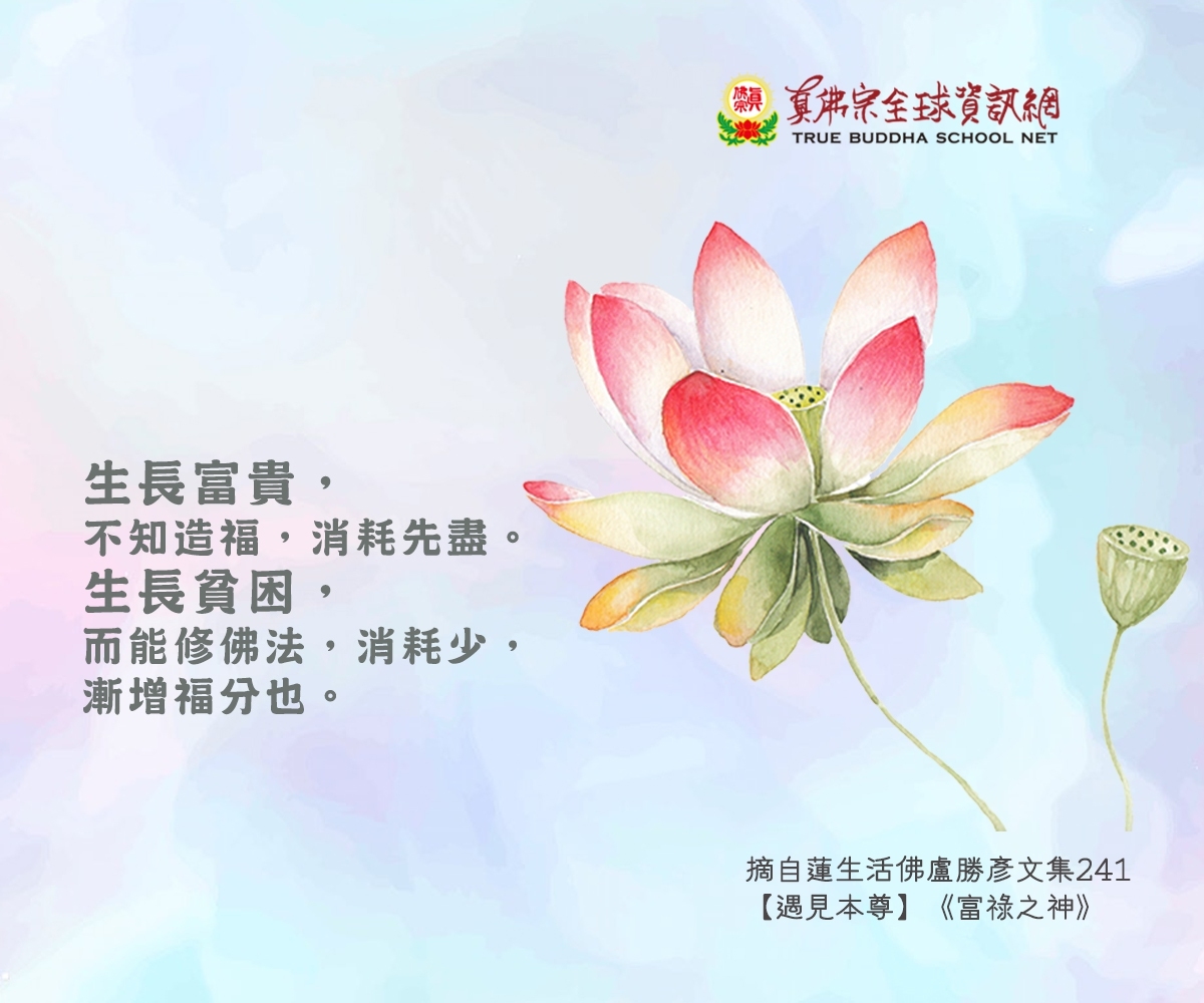「珍惜如此的福分難得,不要亂花費金錢,生活可以寬裕一些些,但,仍然要布施。例如:印善書、塑金身、建道場、幫助貧困的人、造橋、鋪路、公益事業、救人急難......。不要太重自己的享福。」